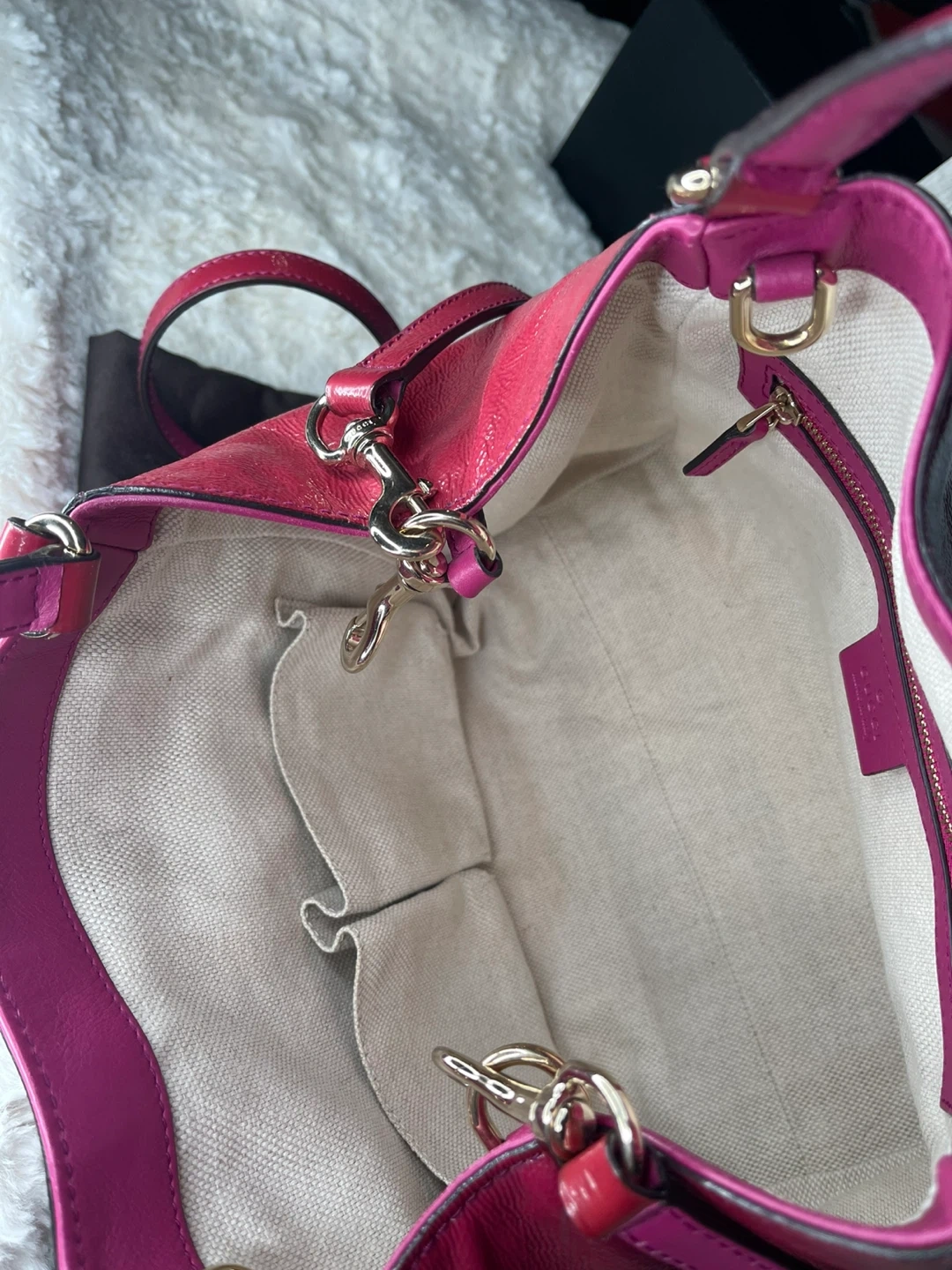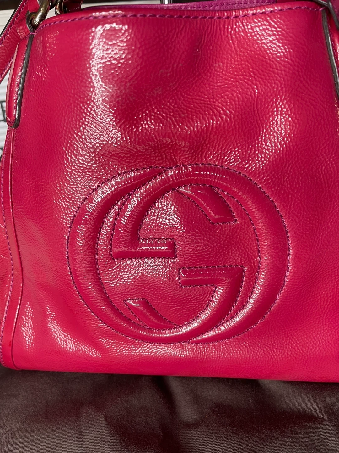We can always count on Gucci for styles that we love now and later. This gorgeous Gucci Patent Leather Soho Crossbody Tote Bag features the iconic bold GG logo embroidered on the front. The bag is made of supple patent leather with goldtone hardware and leather tassel. This beauty has a spacious interior and will hold all of your daily essentials in style.