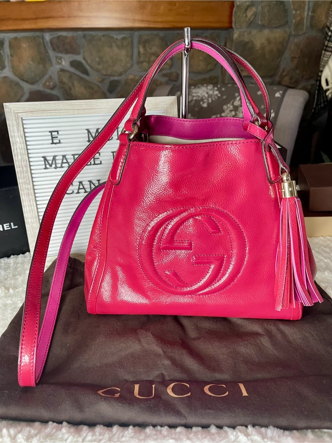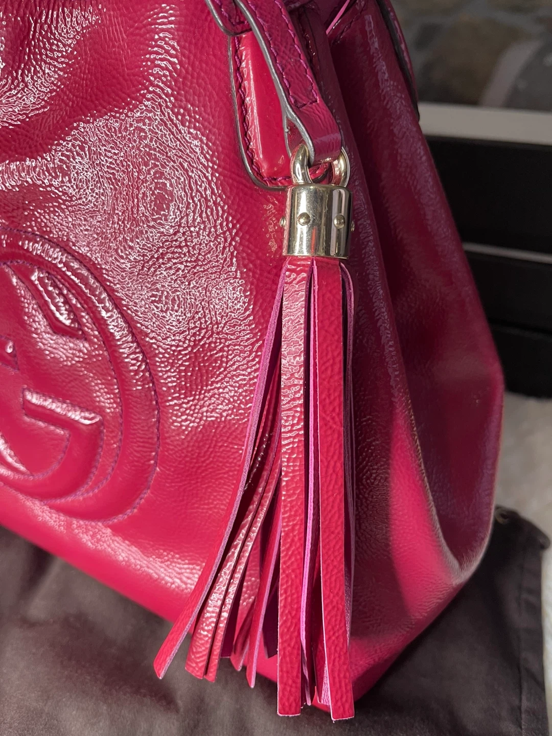 We can always count on Gucci for styles that we love now and later. This gorgeous Gucci Patent Leather Soho Crossbody Tote Bag features the iconic bold GG logo embroidered on the front. The bag is made of supple patent leather with goldtone hardware and leather tassel. This beauty has a spacious interior and will hold all of your daily essentials in style.