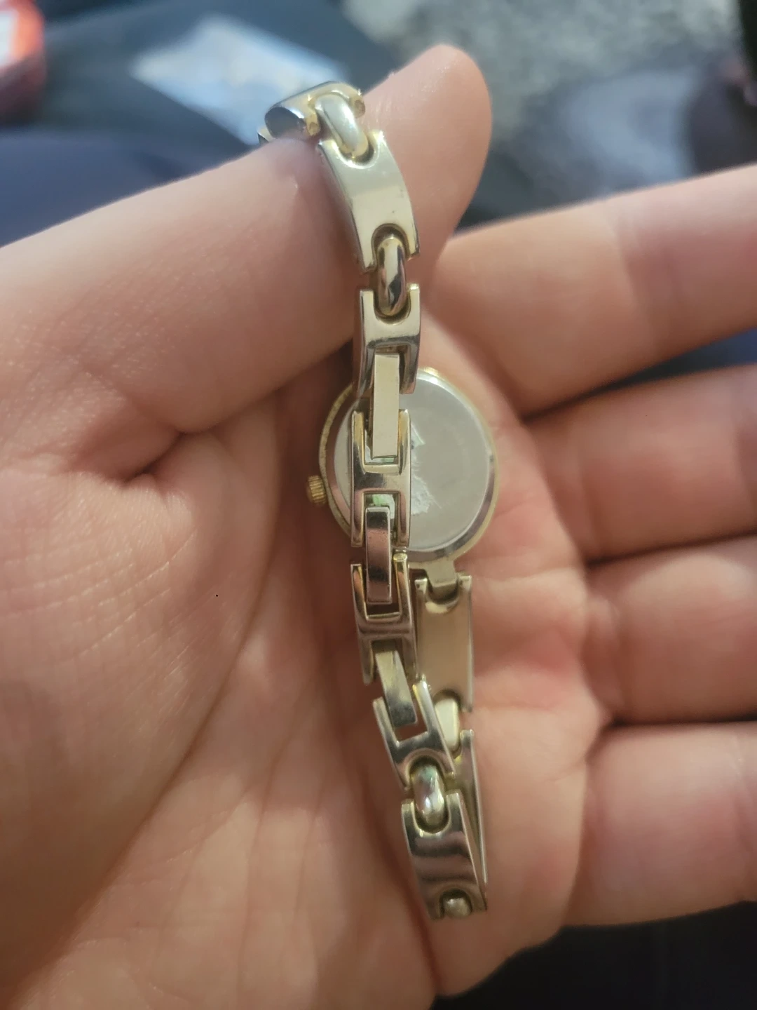 This is a gold-tone quartz watch for women. It's a classic timepiece with a clean, white dial and decorative stones on the band. A reliable watch for everyday wear.