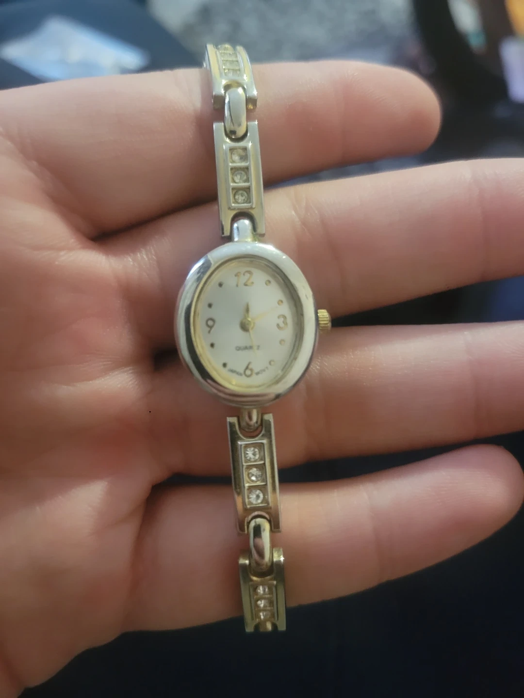 This is a gold-tone quartz watch for women. It's a classic timepiece with a clean, white dial and decorative stones on the band. A reliable watch for everyday wear.