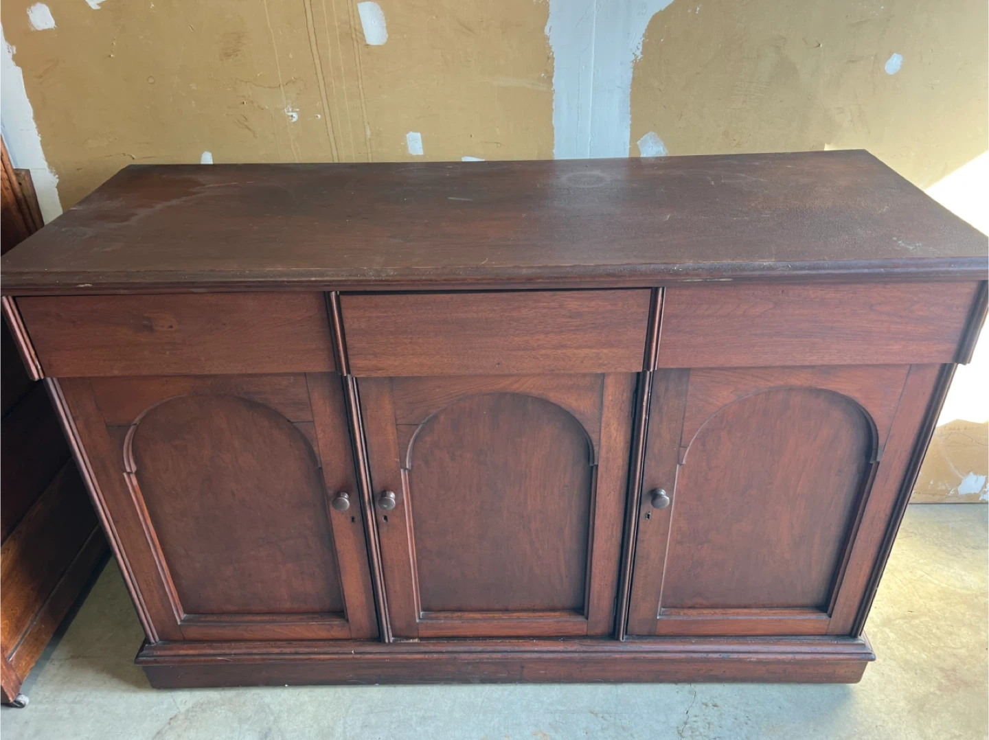 A used classic antique dark wood buffet or sideboard with three cabinet doors and a central drawer. It's made of solid wood with arched panel detailing on the doors. This piece would be great for storage in a dining room or living area.