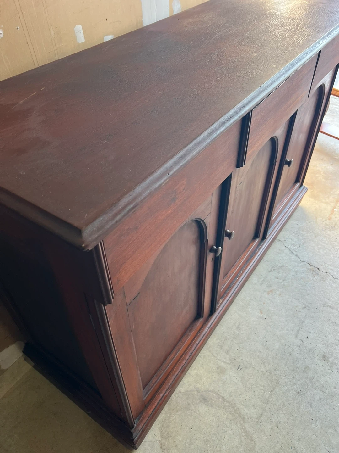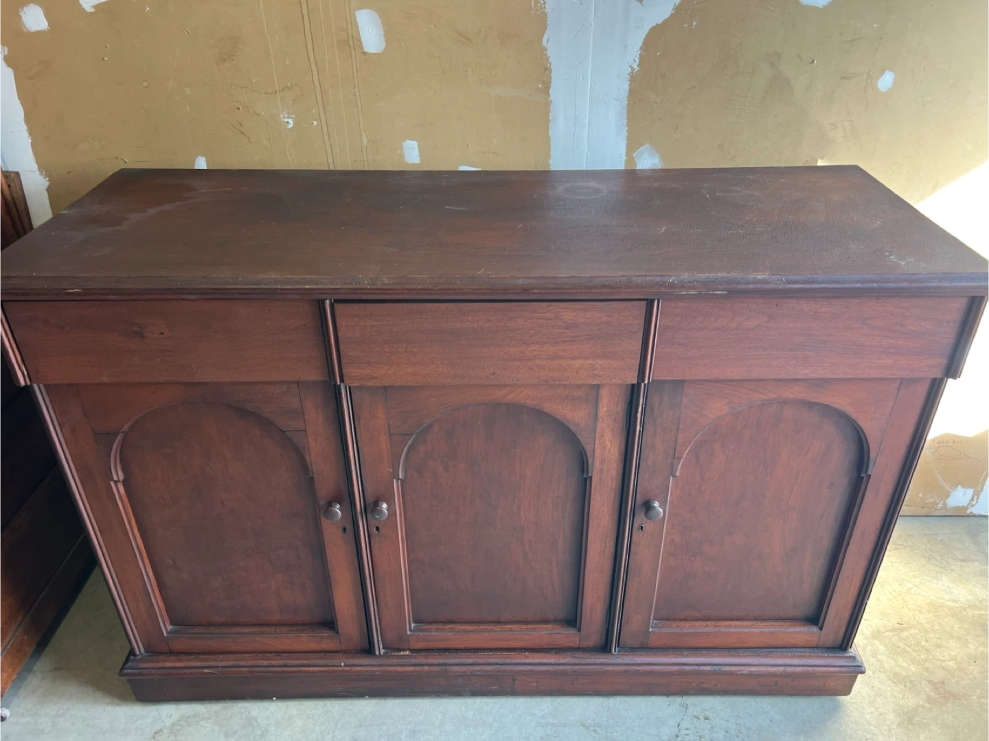 A used classic antique dark wood buffet or sideboard with three cabinet doors and a central drawer. It's made of solid wood with arched panel detailing on the doors. This piece would be great for storage in a dining room or living area.