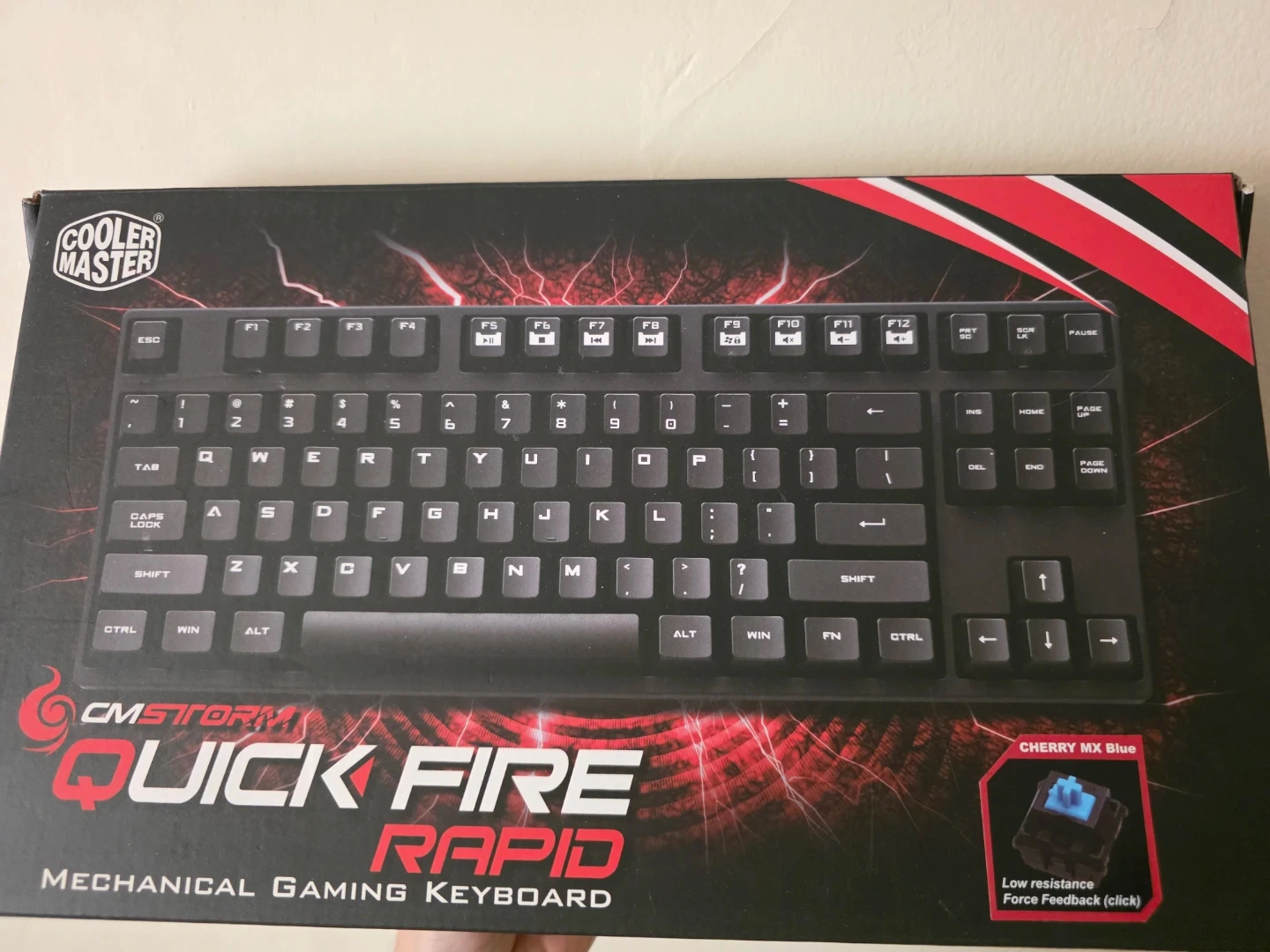 This is a Cooler Master CM Storm QuickFire Rapid mechanical gaming keyboard. It features Cherry MX Blue switches for low resistance and force feedback. It's a compact, tenkeyless design perfect for gaming setups.