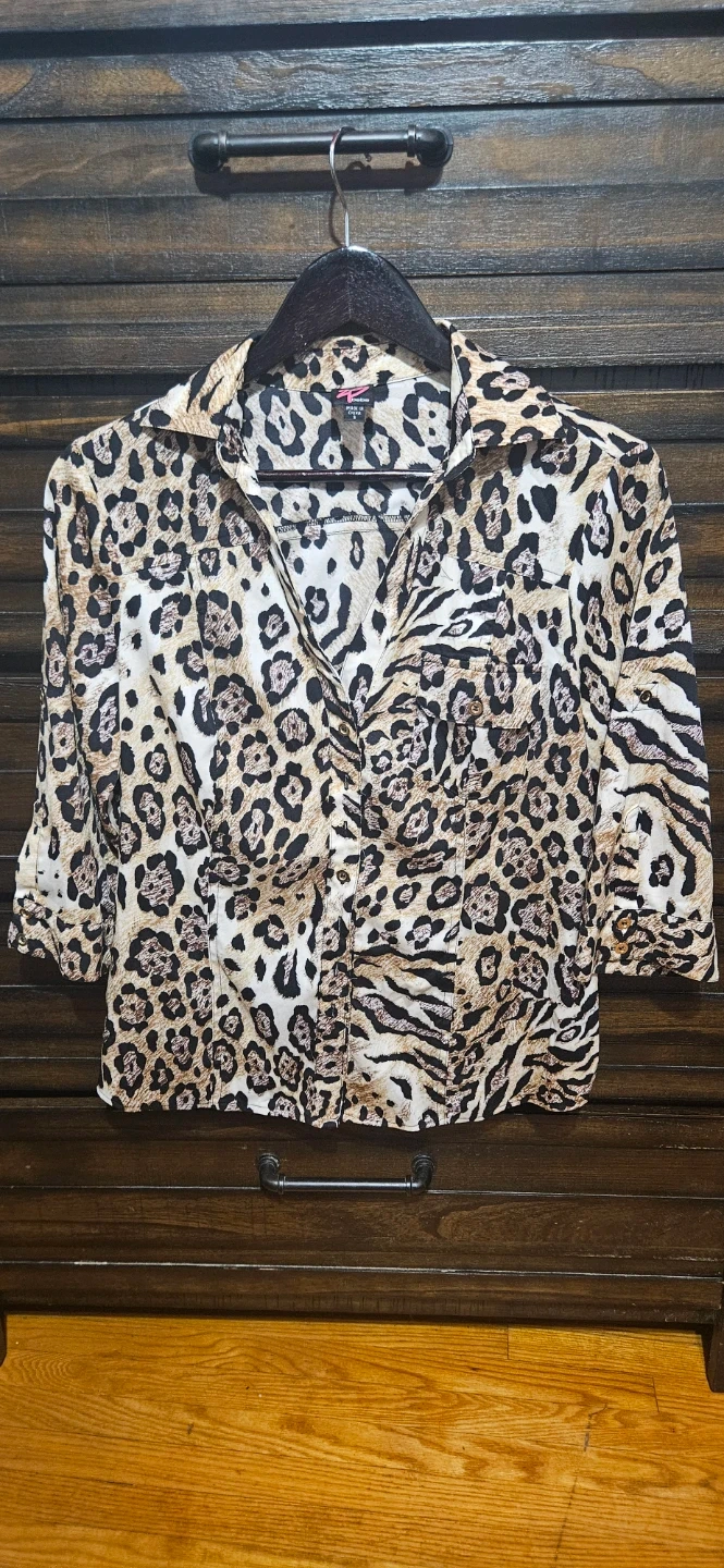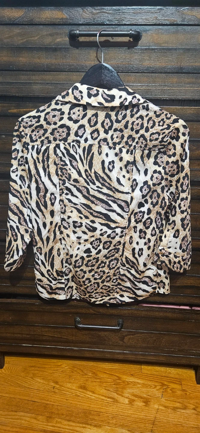 Stylish Bebe button-up shirt with a bold leopard print. Tag displays size small, but fits like a size Medium, perfect for an elegant outfit. This top features a classic collar and a comfortable, lightweight feel.🥕🥕🥕🥕🥕