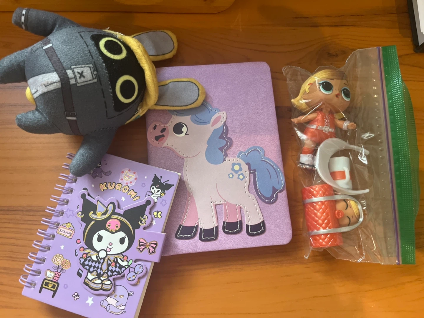 Includes one LOL Surprise doll in its packaging with accessories. Also comes with a Kuromi spiral notebook and a fuzzy plush toy. There's also a plain purple notebook with a unicorn design on it. These are fun toys for collectors or kids!