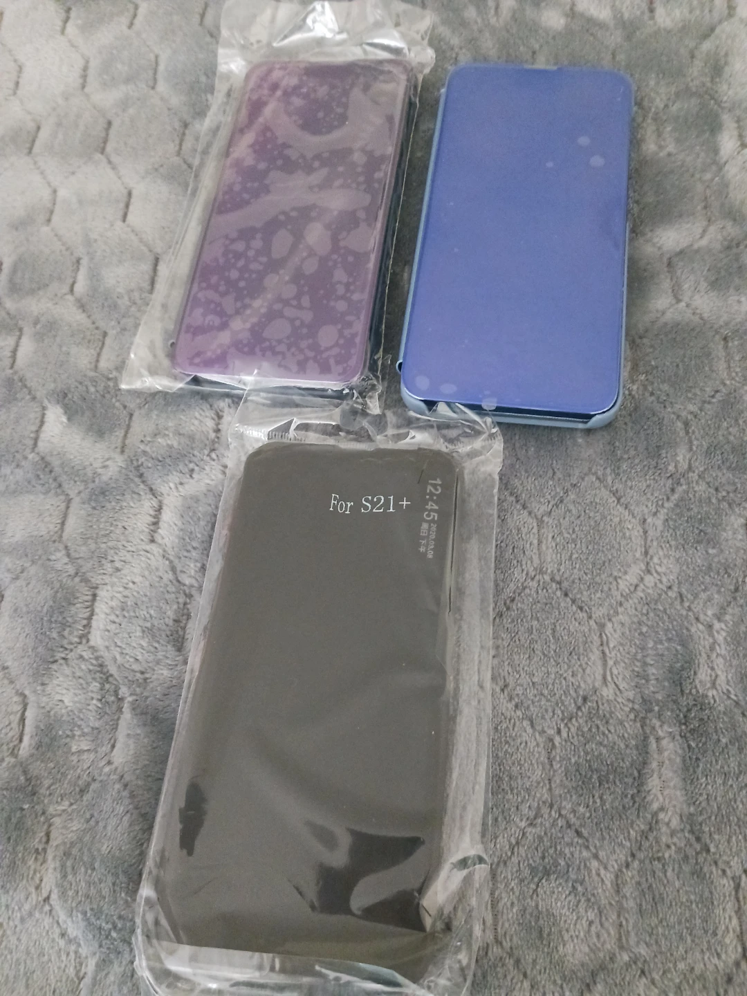 Three phone cases included. One purple, one blue, and one black. The black case is for the Samsung S21+ 5G & purple case it is for S21 + 5G & and the blue it is for Samsung A13 5G .