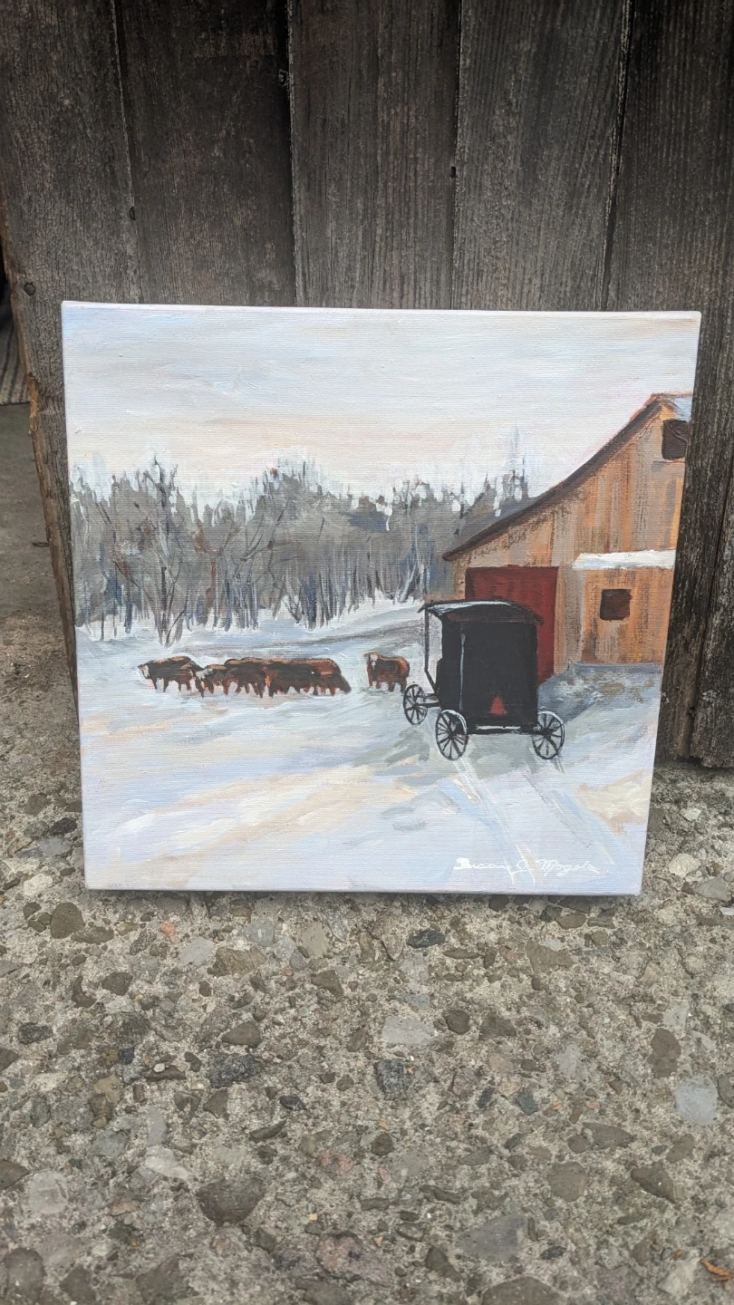 This is an original acrylic painting on canvas depicting a winter scene with a horse-drawn buggy and cattle near a barn. The artist's signature is visible on the front. A business card for artist Susan Mogelin is attached to the back. It's a lovely piece for home decor. Perfect for adding a touch of rustic charm to any room!