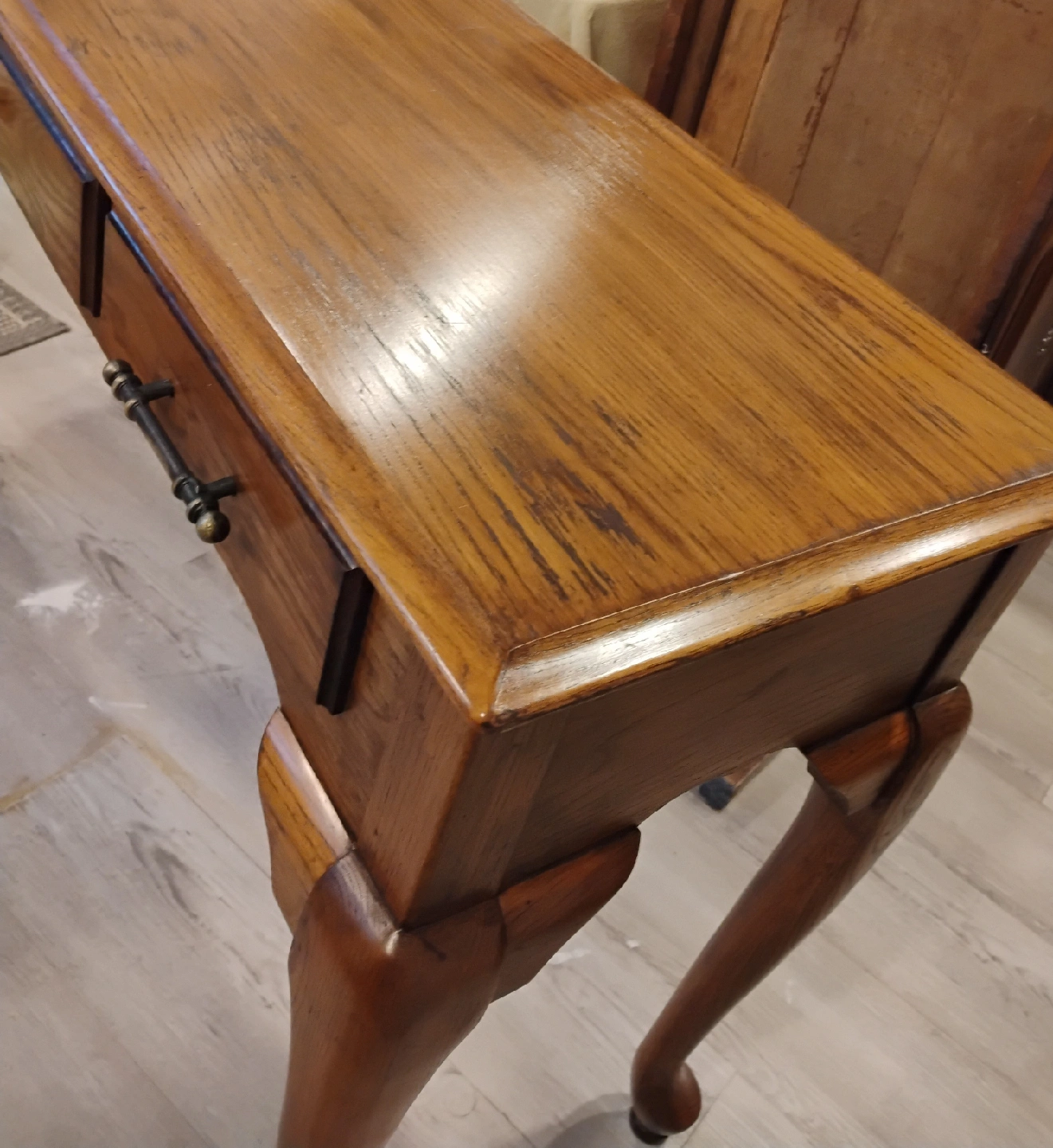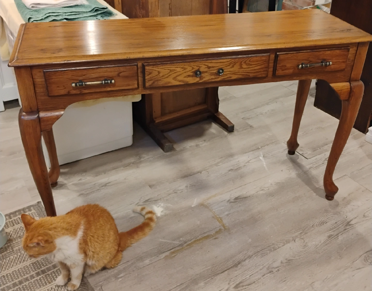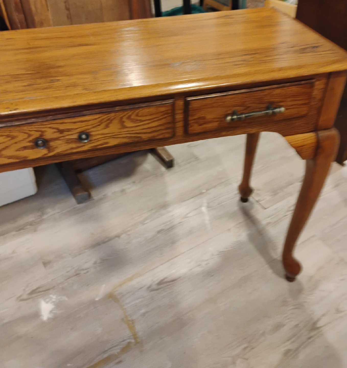 Console table in solid oak. Light chestnut gel stained with brass handles. Middle drawer functional, side drawers are false. Recently refinished Minor flaws made to create a rustic look, very subtle. Beautiful in any room! Bargain price at $80