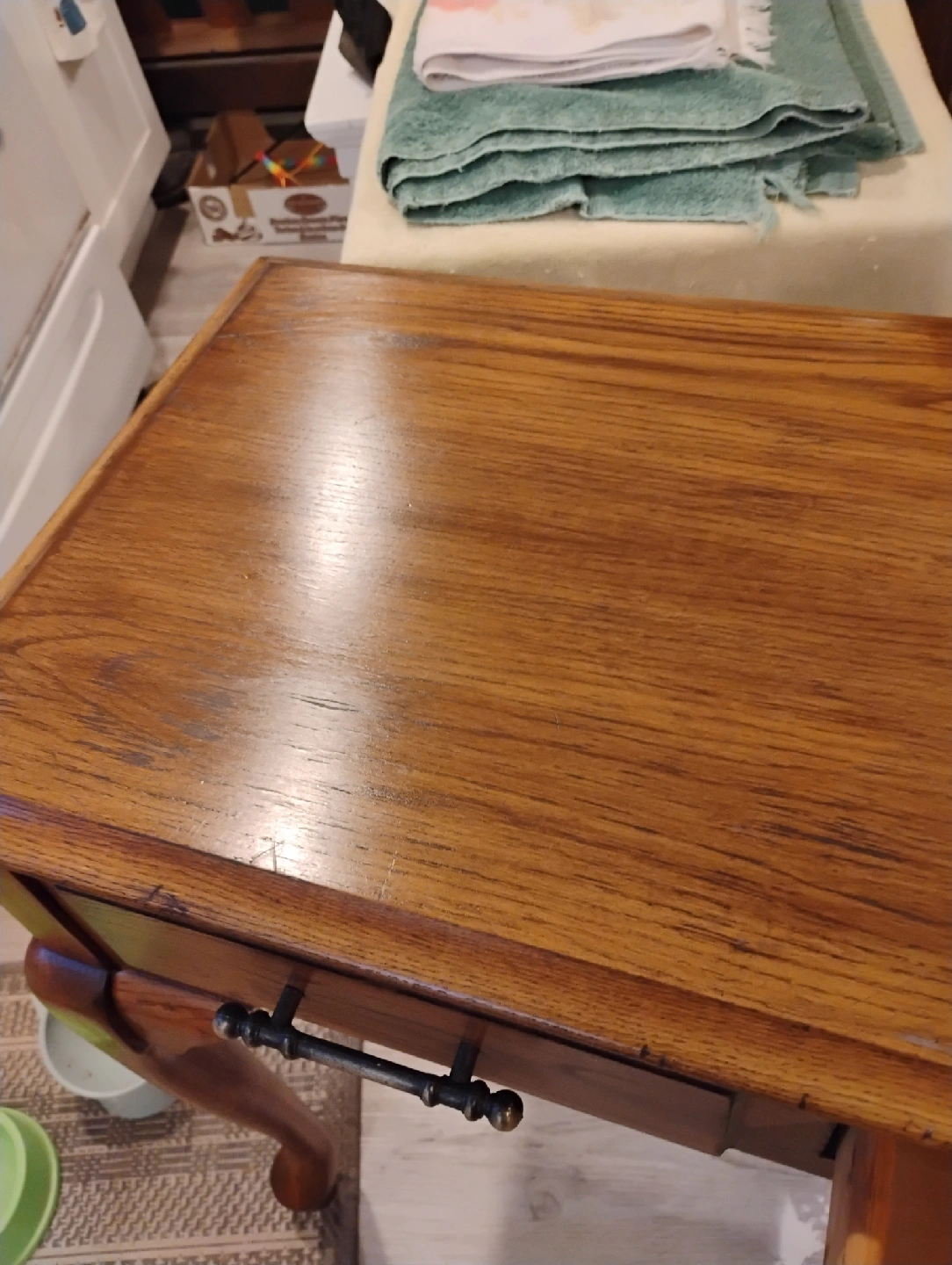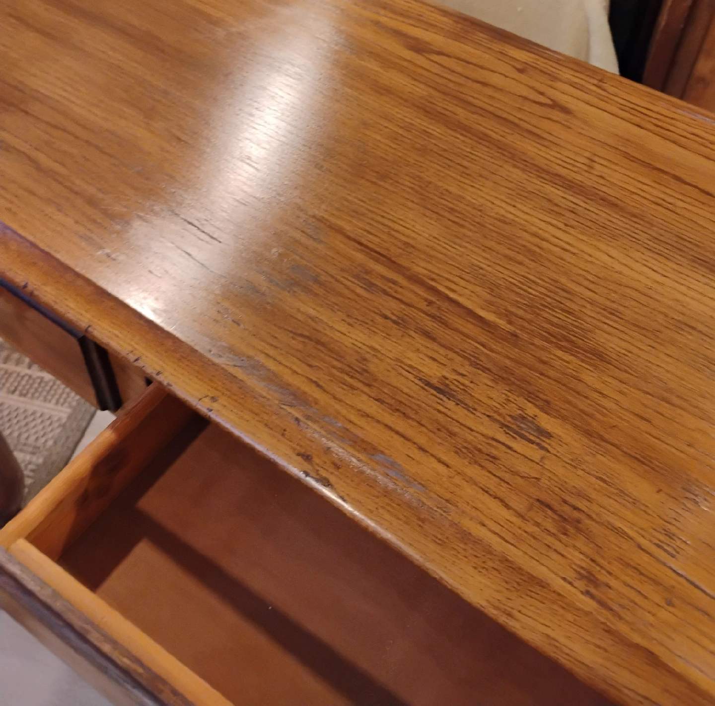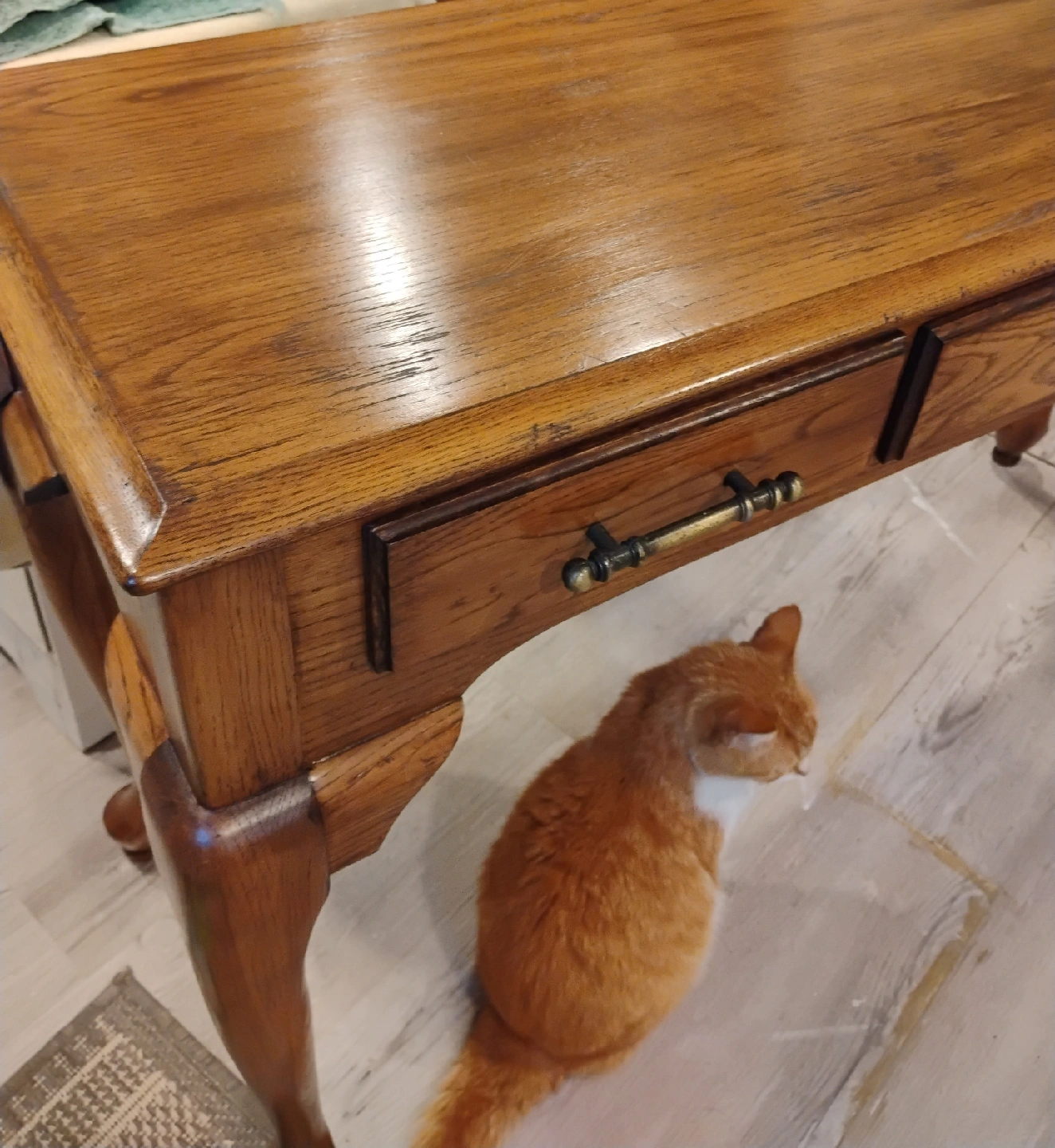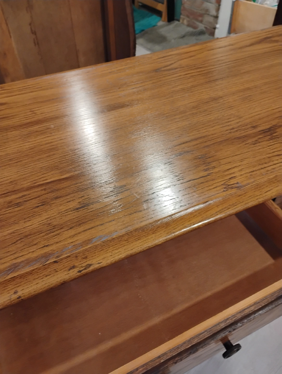 Console table in solid oak. Light chestnut gel stained with brass handles. Middle drawer functional, side drawers are false. Recently refinished Minor flaws made to create a rustic look, very subtle. Beautiful in any room! Bargain price at $80