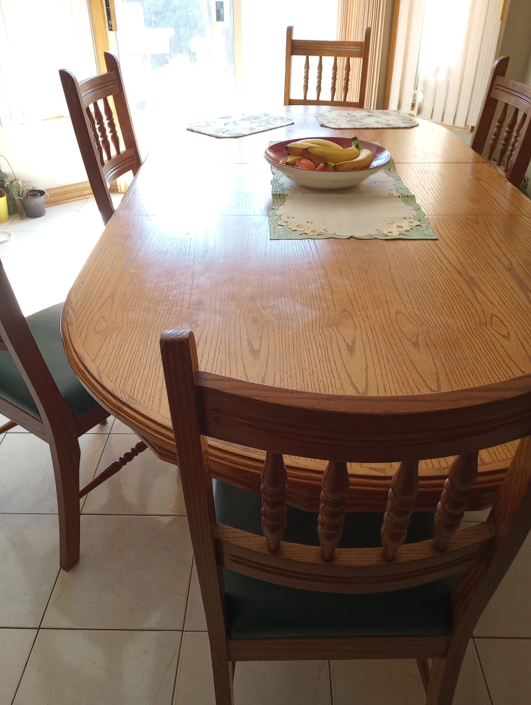10Selling an oak dining table with four matching chairs. The table has a classic, timeless design that would fit well in many homes. The chairs have green padded seats for extra comfort. It's a sturdy set that's ready for a new home!