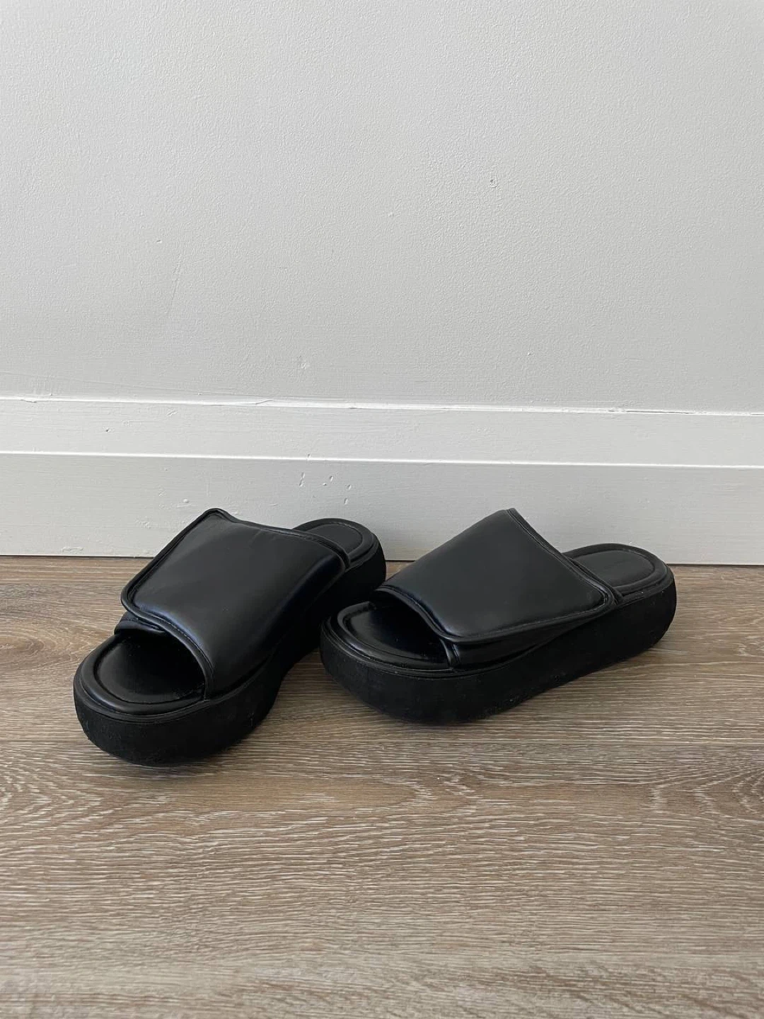 1000+🍁FINAL SALE ALL NOVEMBER🍁 Moving — all prices reduced. Final price. Check my other listings. ✅ New Black leather platform slides. Size 9. Features a unique padded strap design. Comfortable and stylish. New , never worn