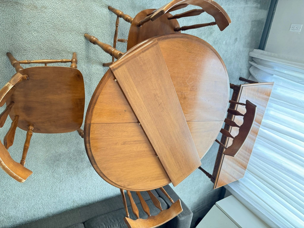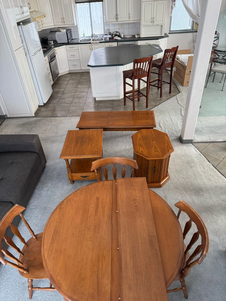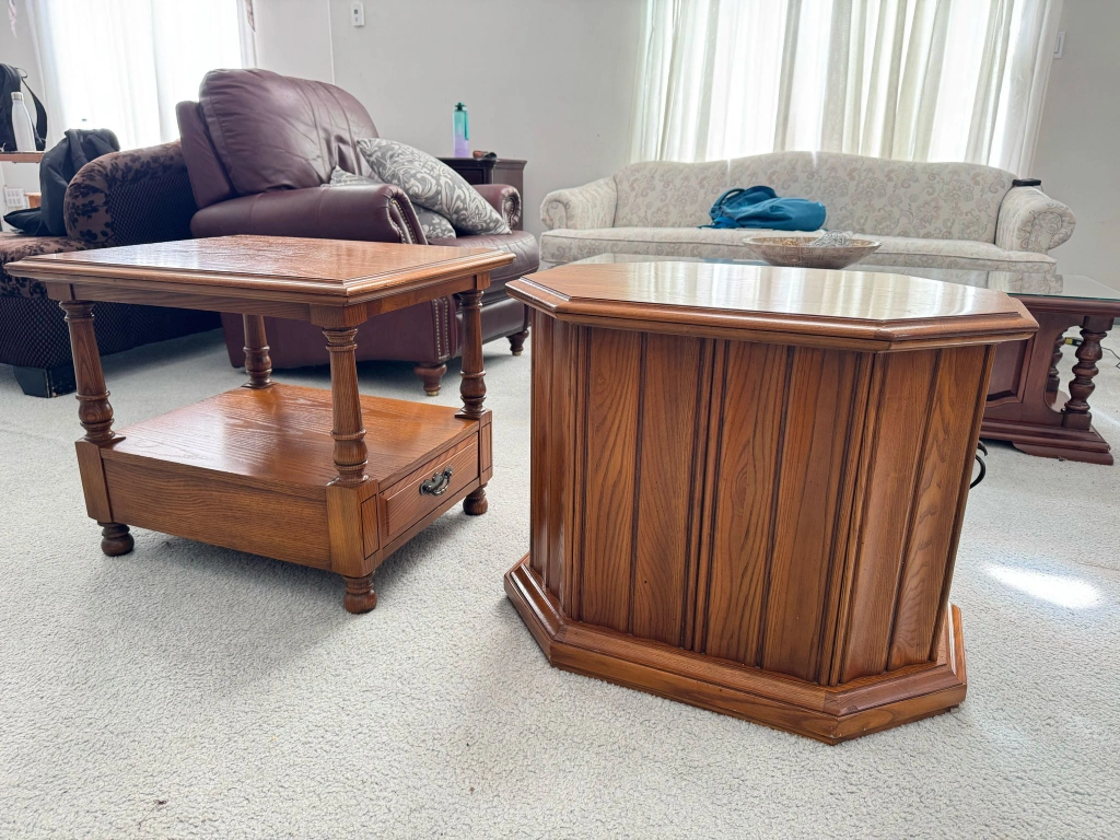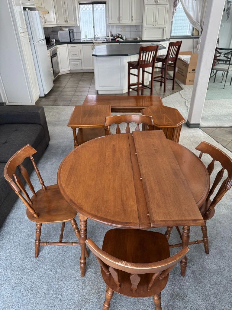 Solid oak wood furniture set. Includes round dining table with leaf, four matching chairs, rectangular coffee table, two end tables (one square, one octagonal). Classic style, some wear consistent with age and use. Excellent for a cozy living space. Delivery available upon request.
