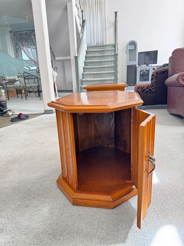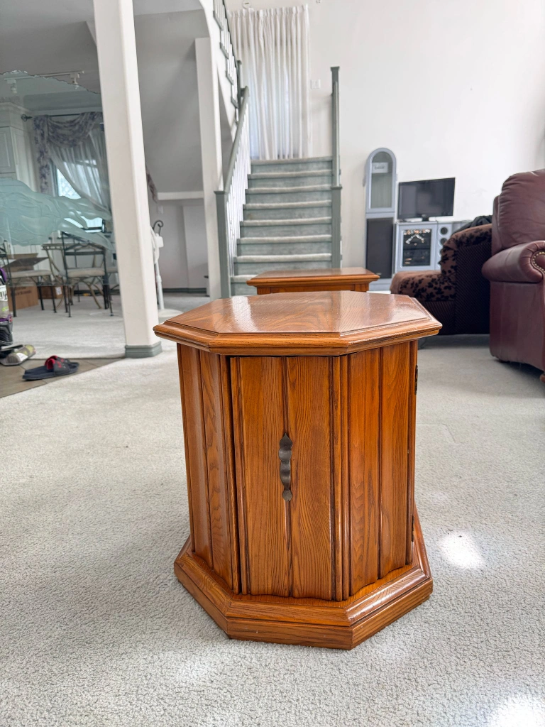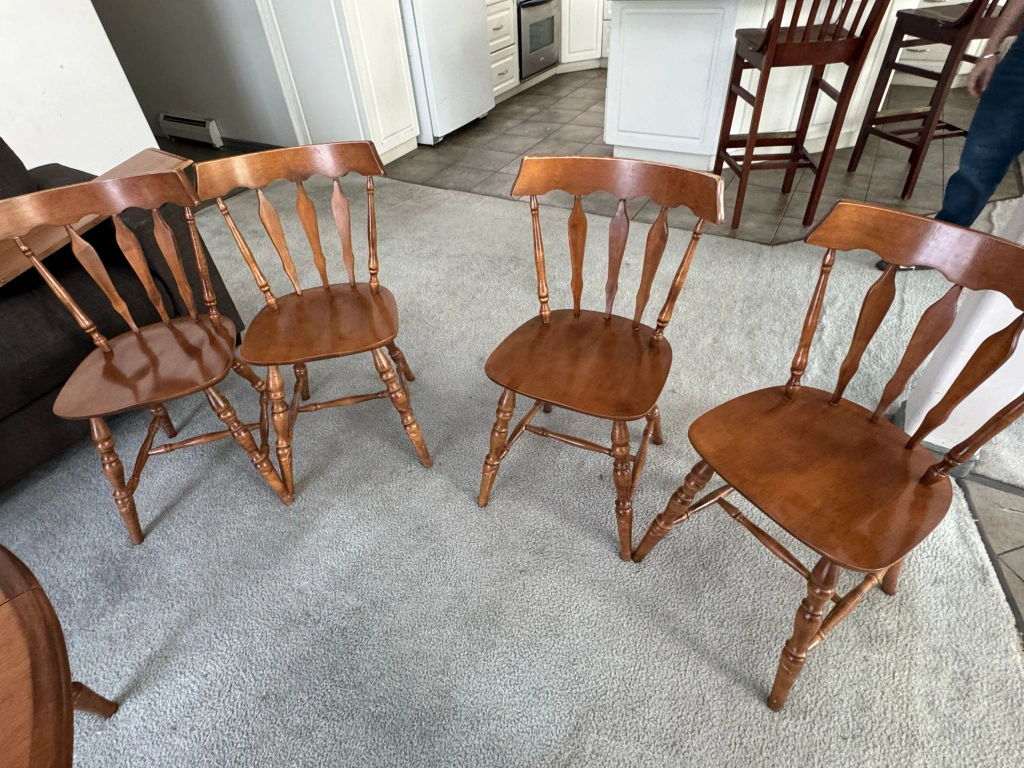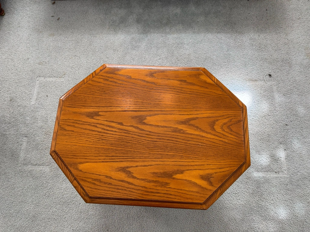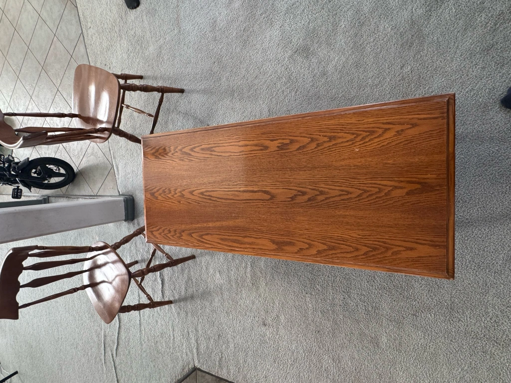 Solid oak wood furniture set. Includes round dining table with leaf, four matching chairs, rectangular coffee table, two end tables (one square, one octagonal). Classic style, some wear consistent with age and use. Excellent for a cozy living space. Delivery available upon request.
