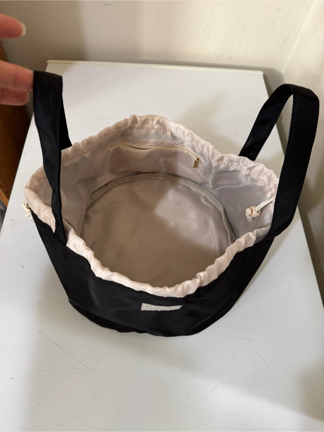 Brand new drawstring makeup bag, still in its original packaging! It's black on the outside with a light-colored lining, perfect for keeping your cosmetics organized at home or while travelling