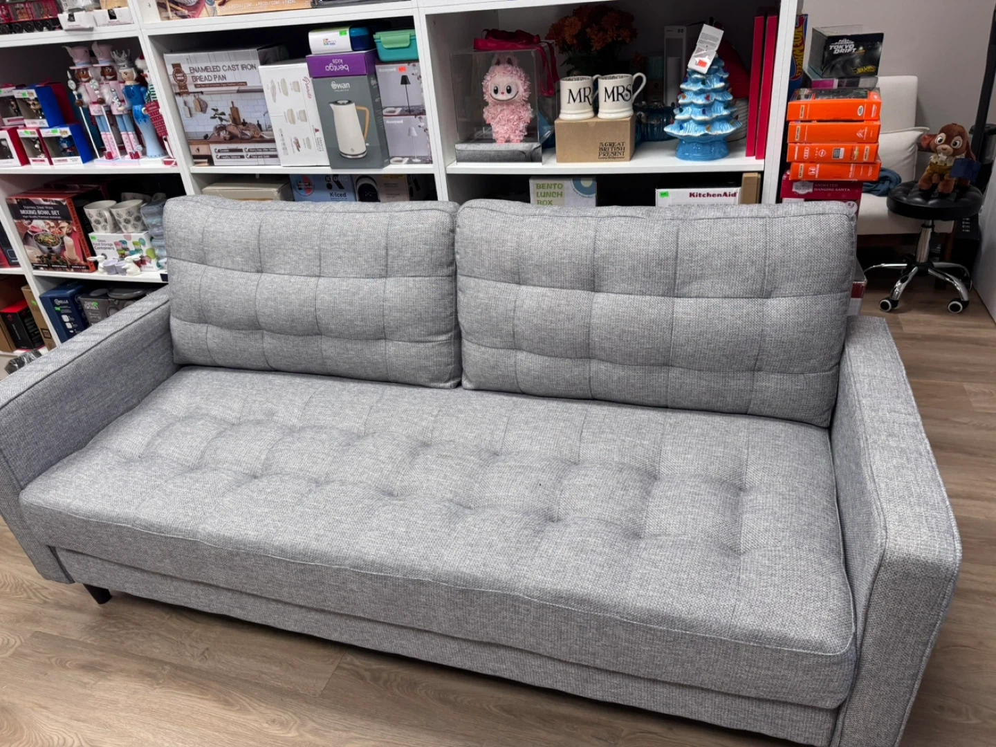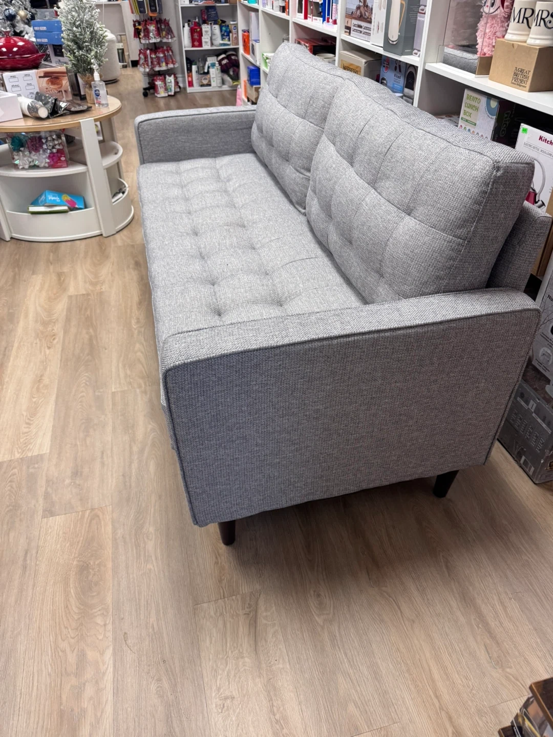 This is a modern two-seater sofa upholstered in grey fabric. It features tufted seat and back cushions with piping detail. The sofa stands on dark wooden legs.