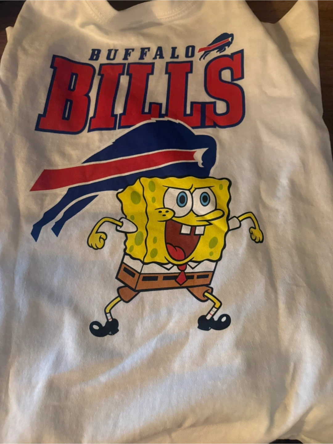 Selling a Spongebob Buffalo Bills t-shirt. It's a size small and made of 100% cotton. The shirt is in good condition and features a fun Spongebob design with the Buffalo Bills logo. Kids size small