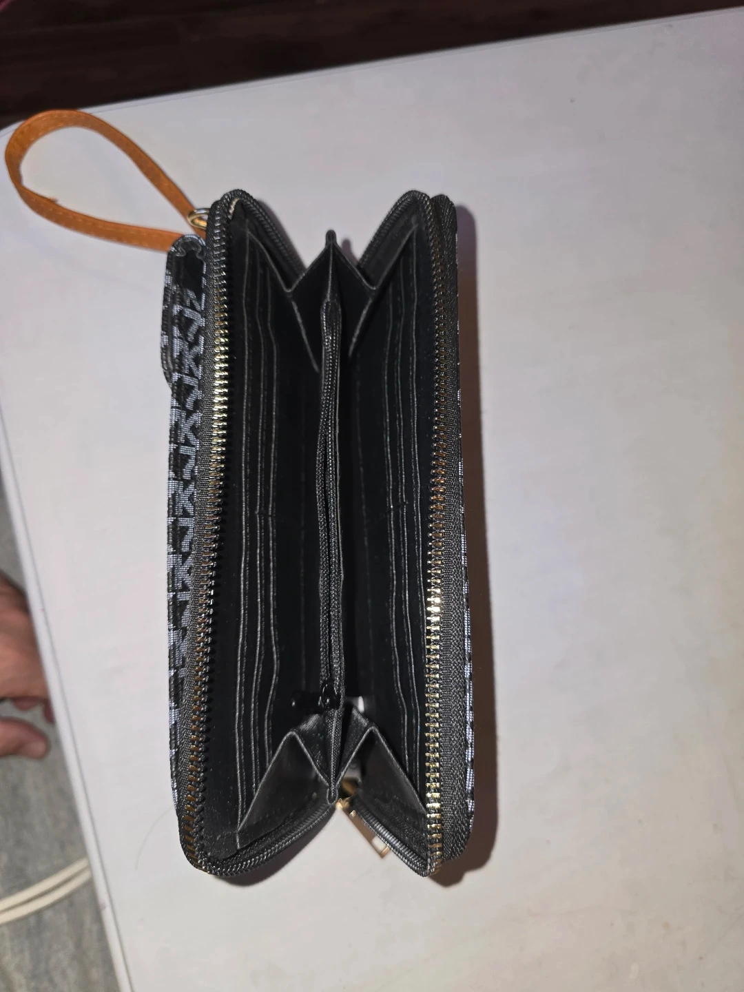 Selling a cute wristlet wallet! It has a stylish black and gray design with a convenient wrist strap it also has a phone case never used. Perfect for keeping your essentials organized on the go.