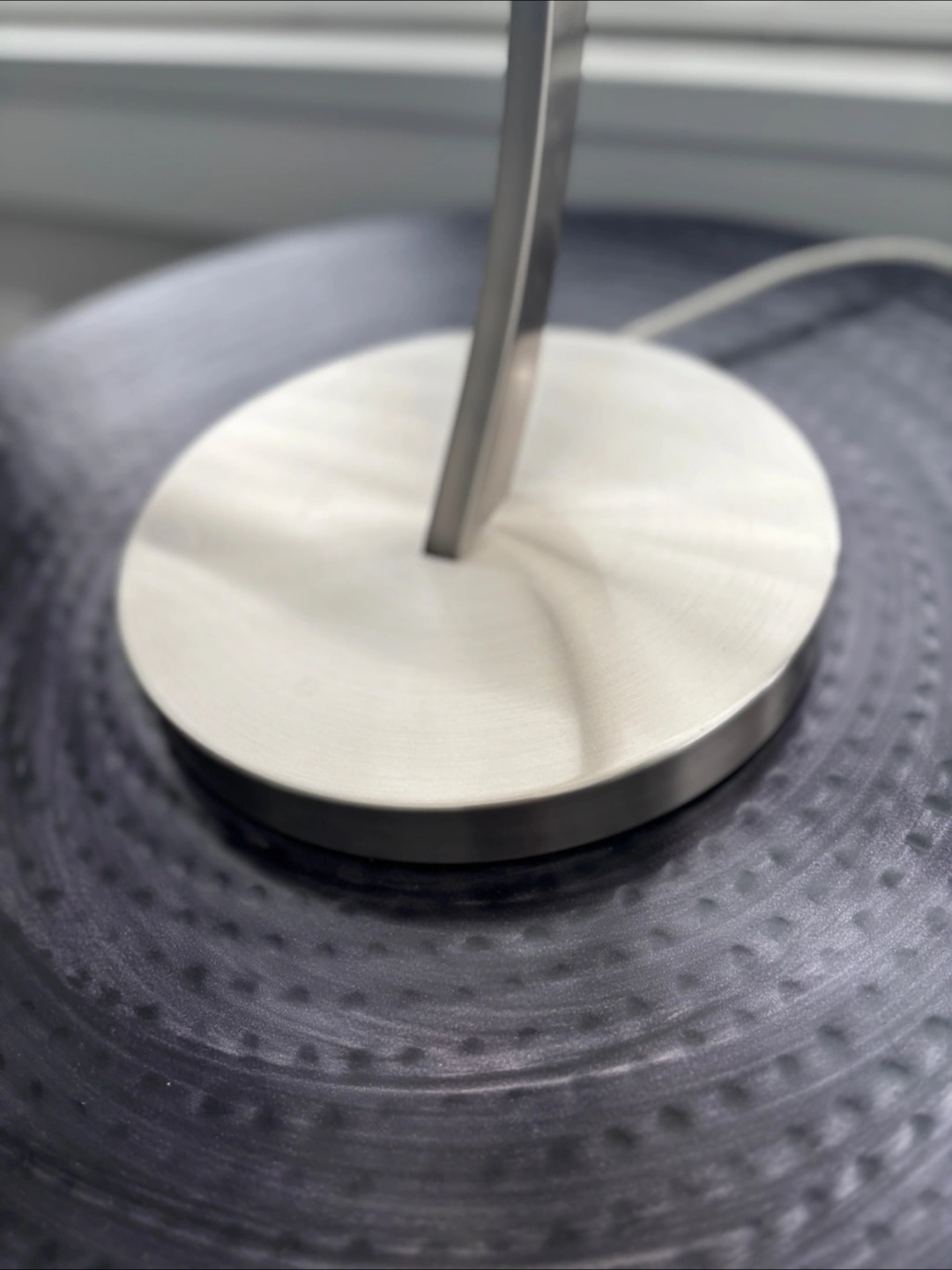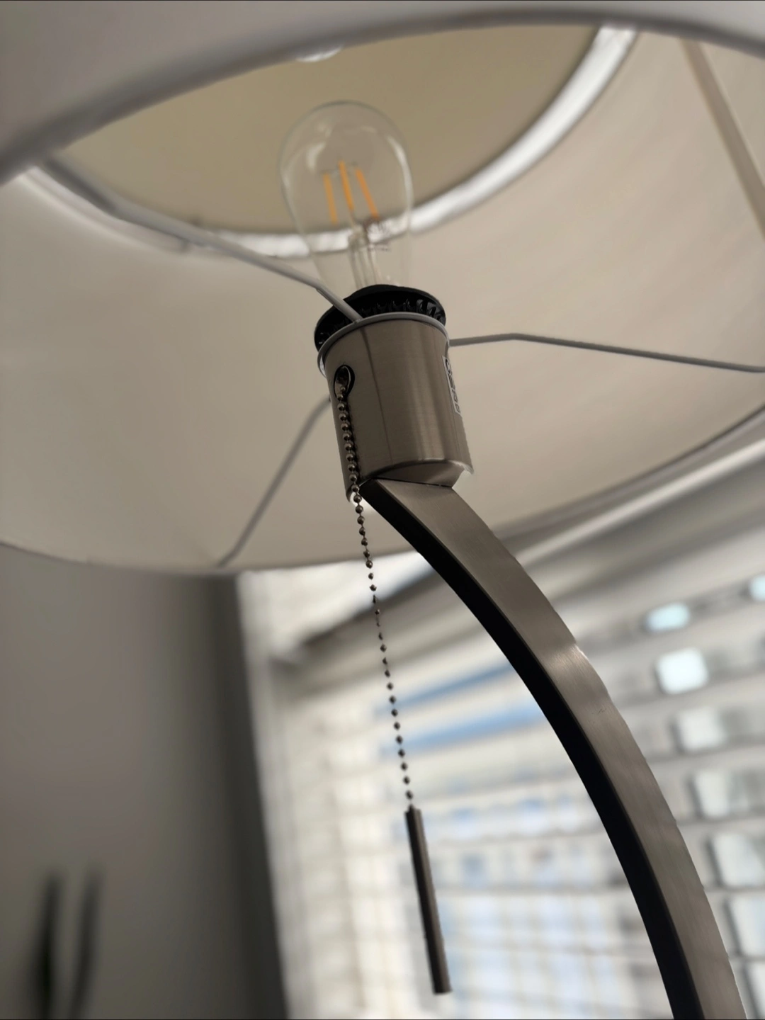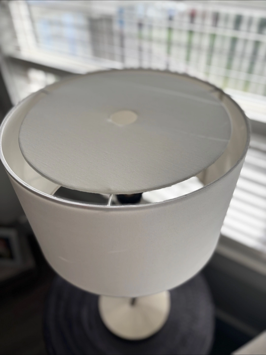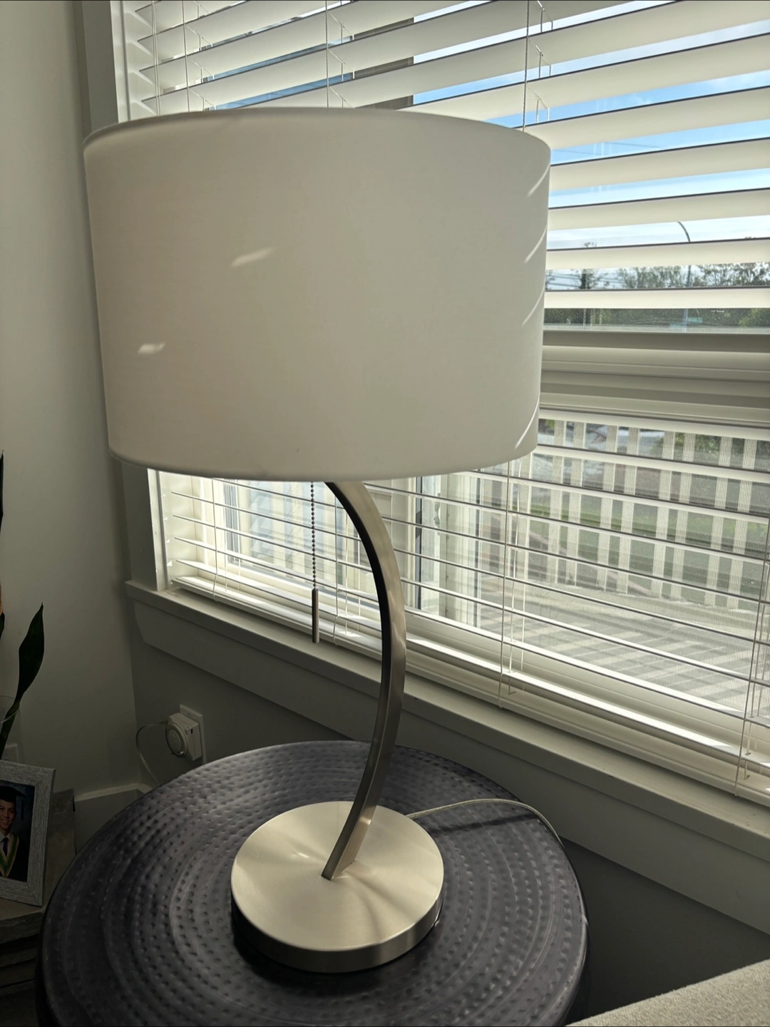 Here's a lovely table lamp with a white shade and a silver base! It's in great shape and would look perfect on a bedside table or in a living room. The lamp has a pull chain.
