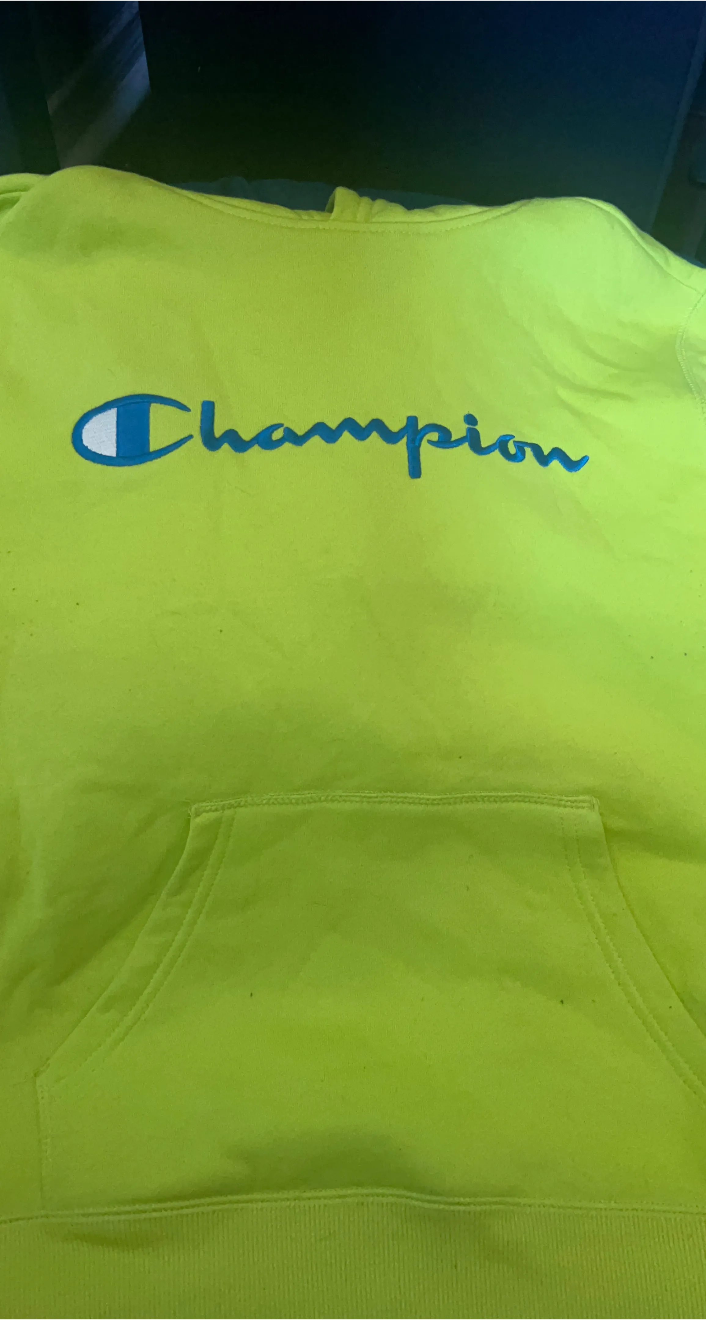 Selling a Champion hoodie in a vibrant neon yellow colour. It features the classic Champion logo in blue across the chest and a front pouch pocket. A cozy and stylish addition to any wardrobe!