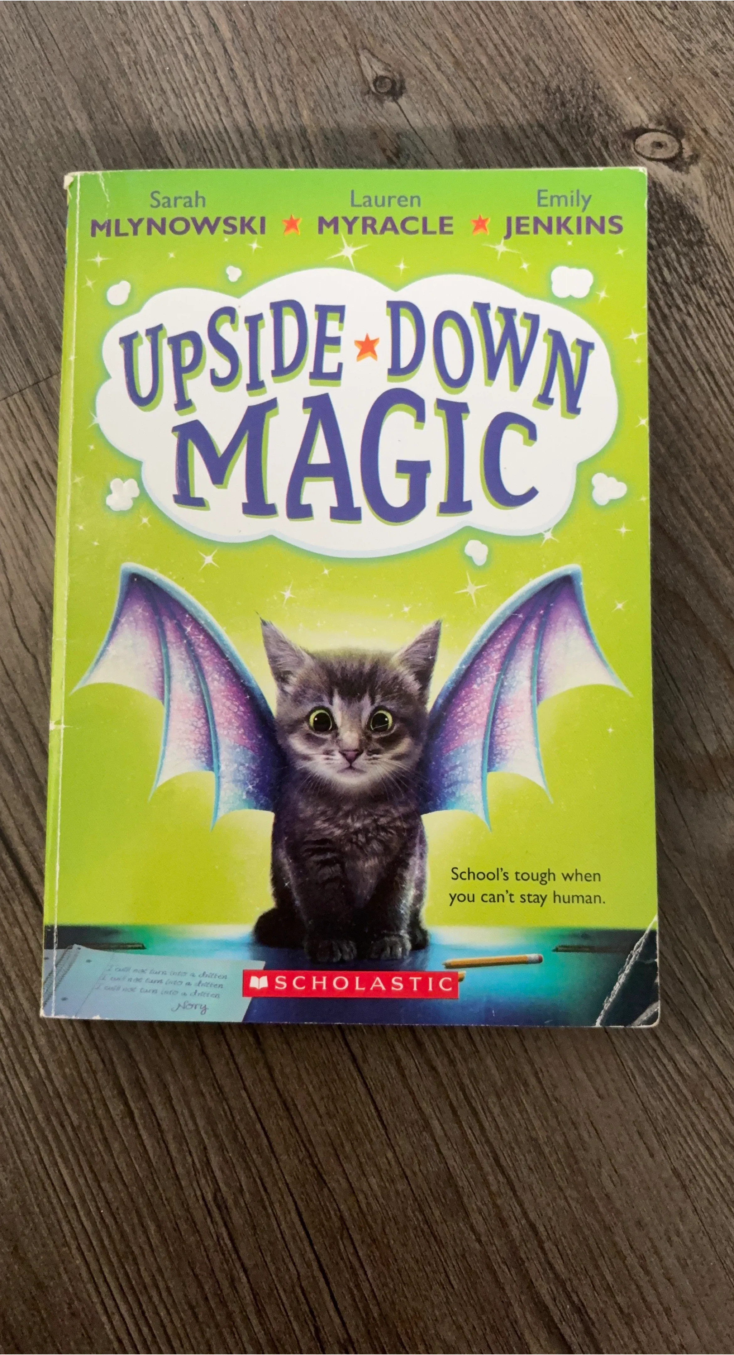 This is the "Upside-Down Magic" book by Sarah Mlynowski, Lauren Myracle, and Emily Jenkins. It's a Scholastic edition, perfect for young readers who enjoy fantasy and magic stories. The book follows the adventures of students at a magic school where things don't always go as planned.