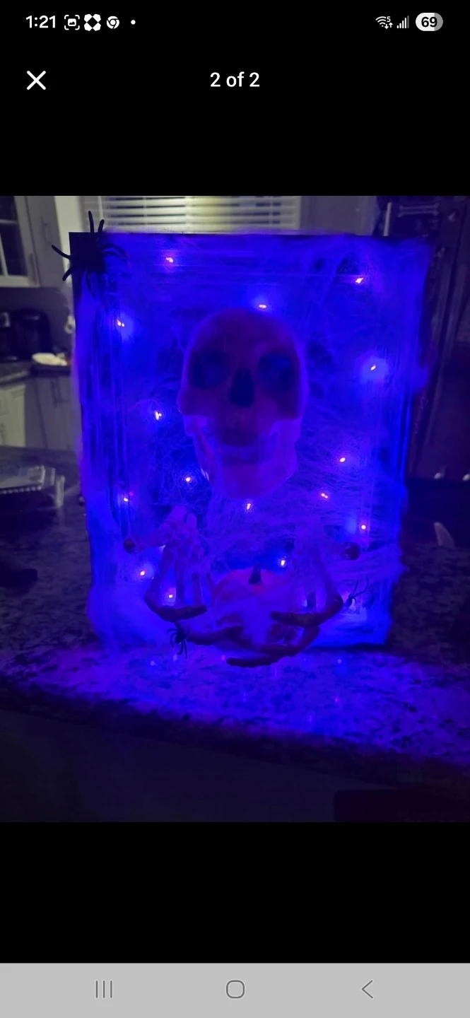 Creepy Halloween decoration featuring a skull with skeleton hands holding a pumpkin. It's surrounded by spooky cobwebs and includes flickering LED lights for an eerie glow. Perfect for setting a haunted scene!
