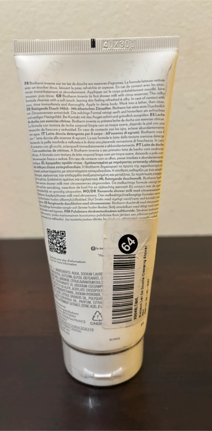 Biotherm Lait de Douche is a cleansing shower milk that leaves skin feeling fresh. It's a creamy formula that works into a lather and then rinses clean. This shower milk has notes of citrus.