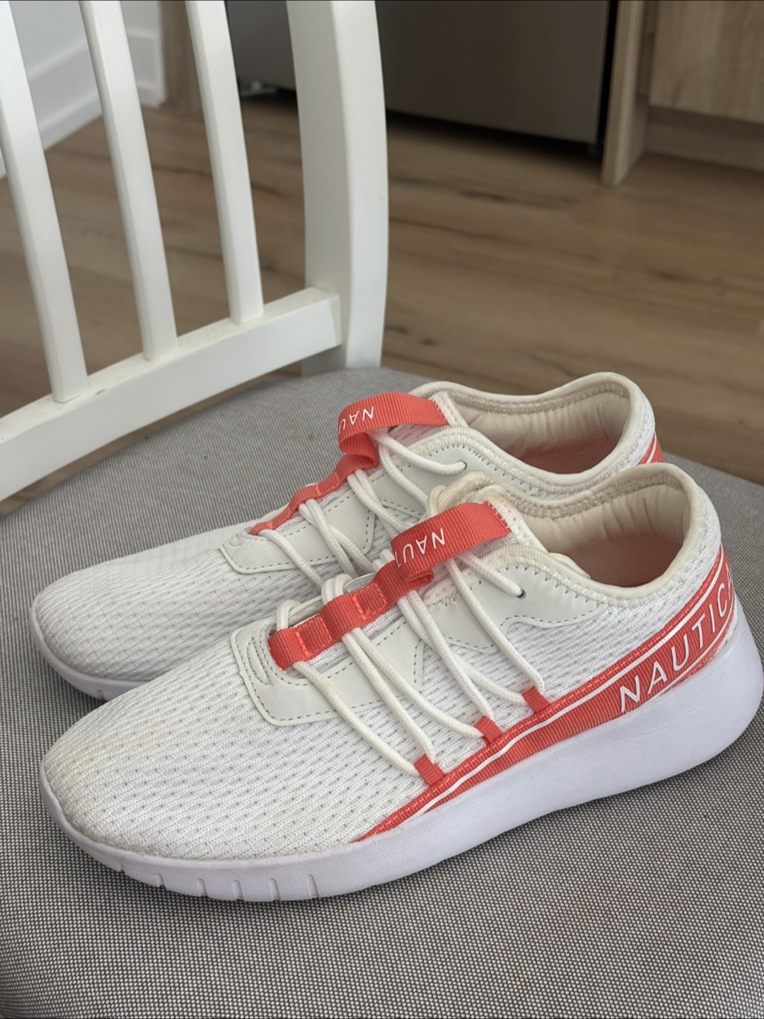 Cute Nautica sneakers in white with coral accents! They're in great shape and ready for a new home. Perfect for everyday wear or light workouts