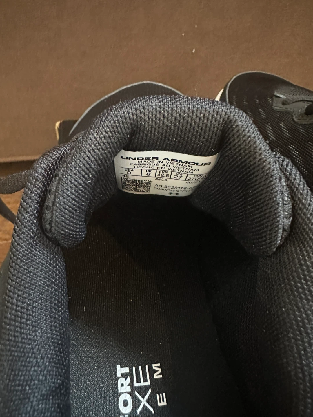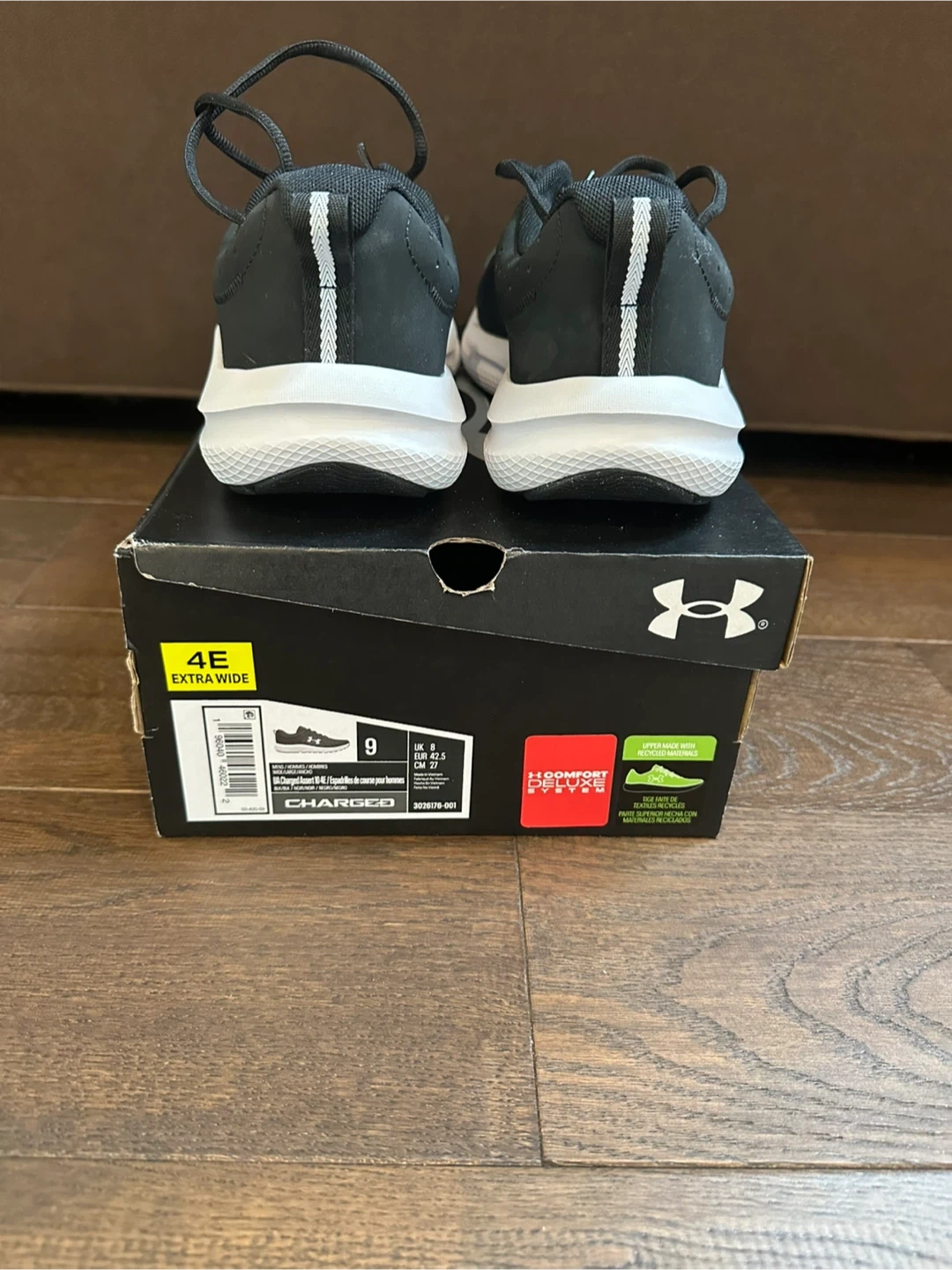 Under Armour Charged Assert 10 running shoes in black and white. Men's size 9, extra wide fit. These shoes come with their original box. They're designed for comfort and support during runs.