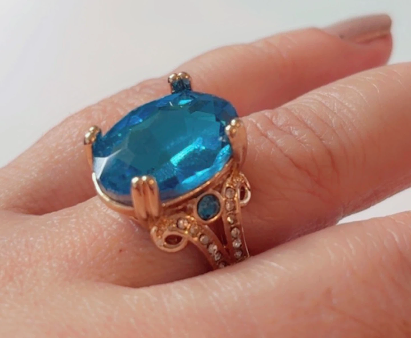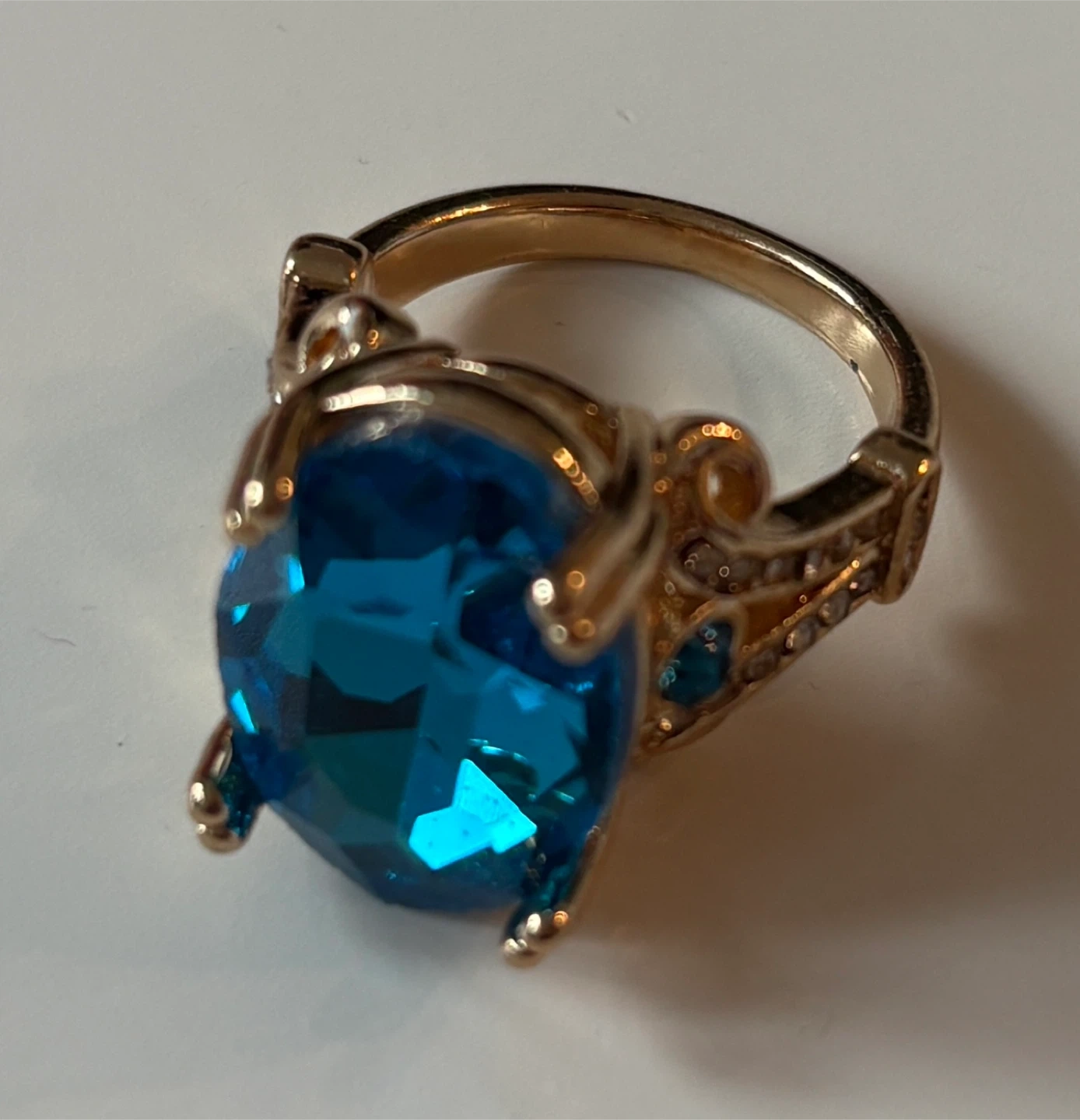 A gorgeous gold-tone ring with a large, oval-shaped blue stone. It has smaller clear stones along the band.