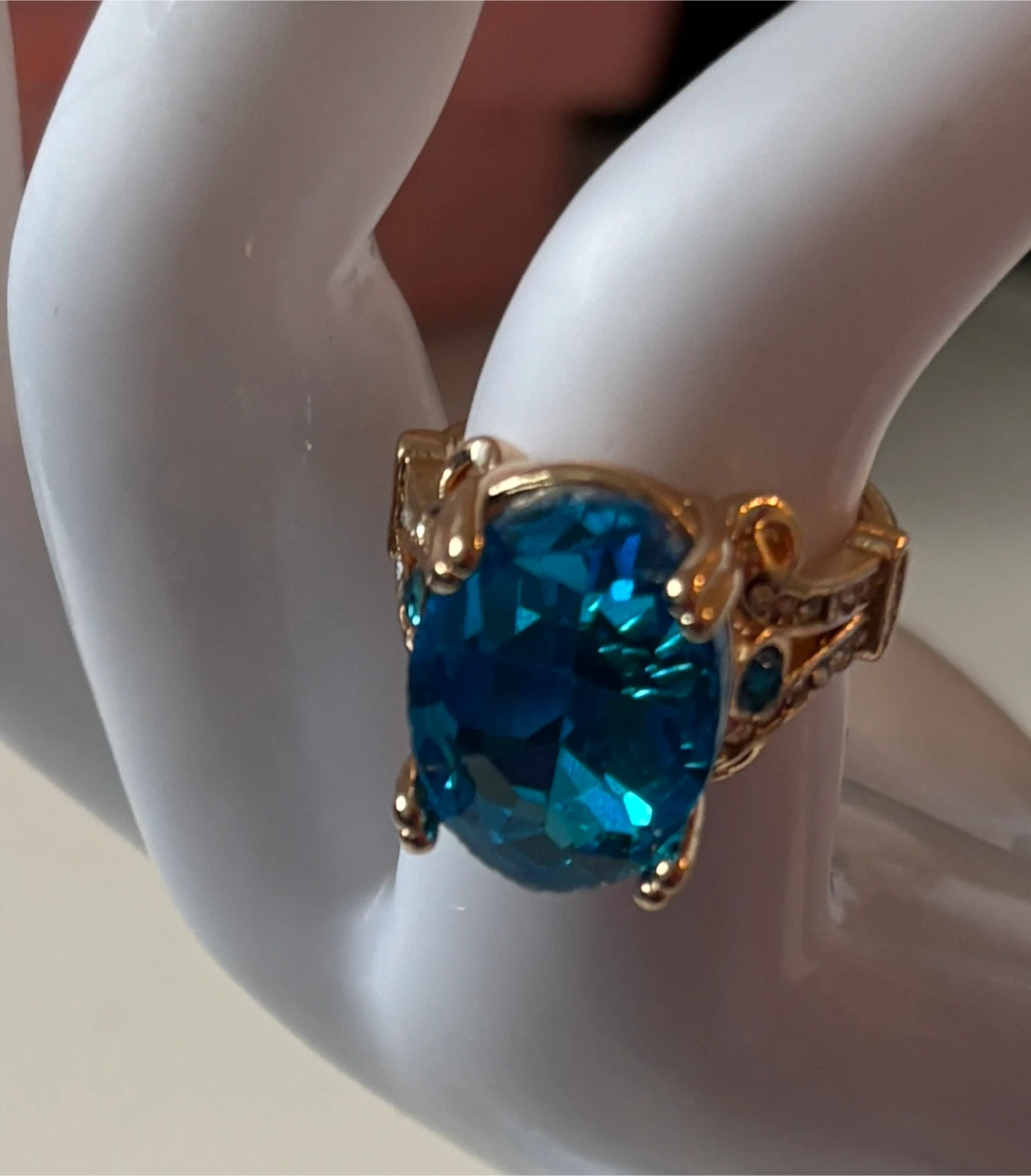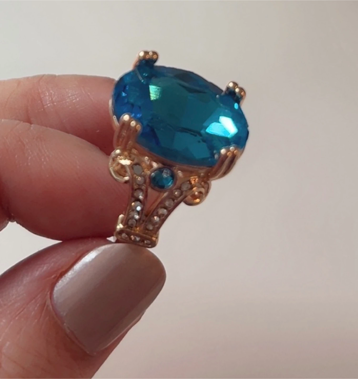 A gorgeous gold-tone ring with a large, oval-shaped blue stone. It has smaller clear stones along the band.