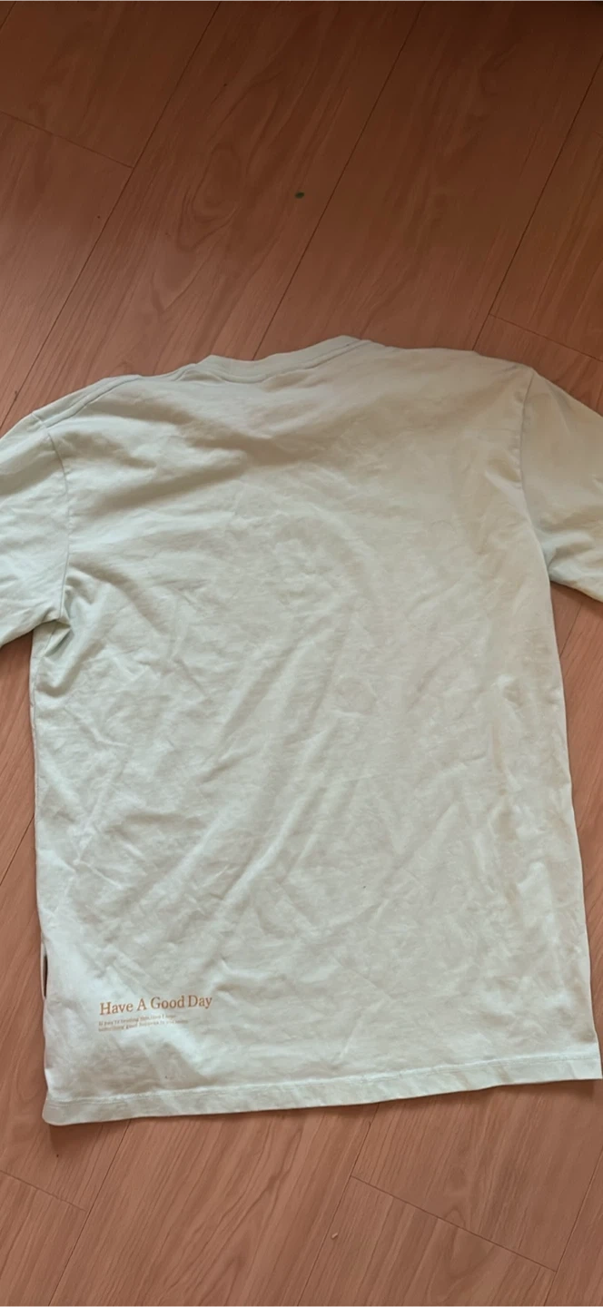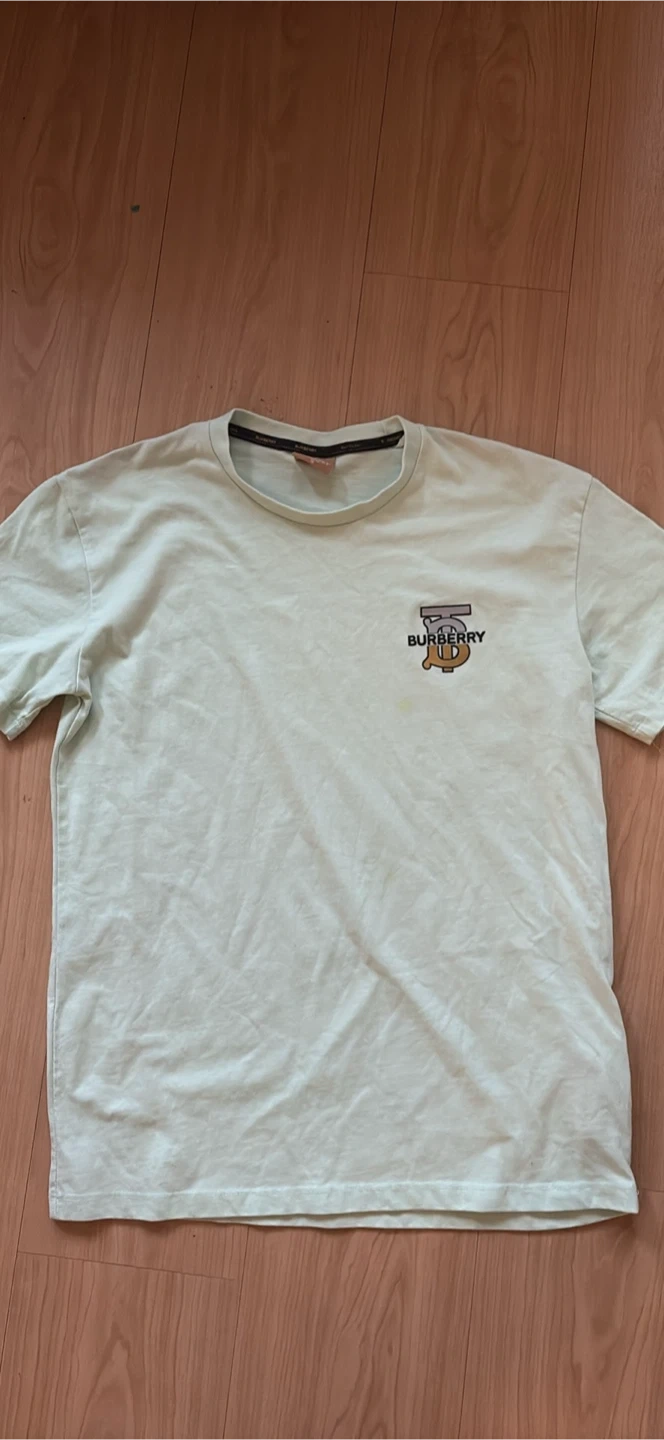 Light green Burberry t-shirt with a graphic print on the front. Small embroidered text detail on the bottom hem reads 'Have A Good Day'. Cotton material. Perfect for casual wear!