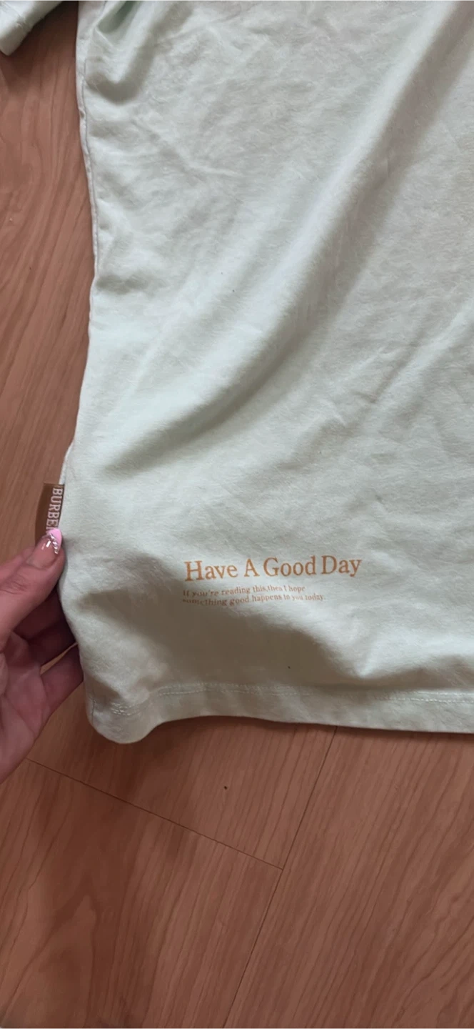 Light green Burberry t-shirt with a graphic print on the front. Small embroidered text detail on the bottom hem reads 'Have A Good Day'. Cotton material. Perfect for casual wear!
