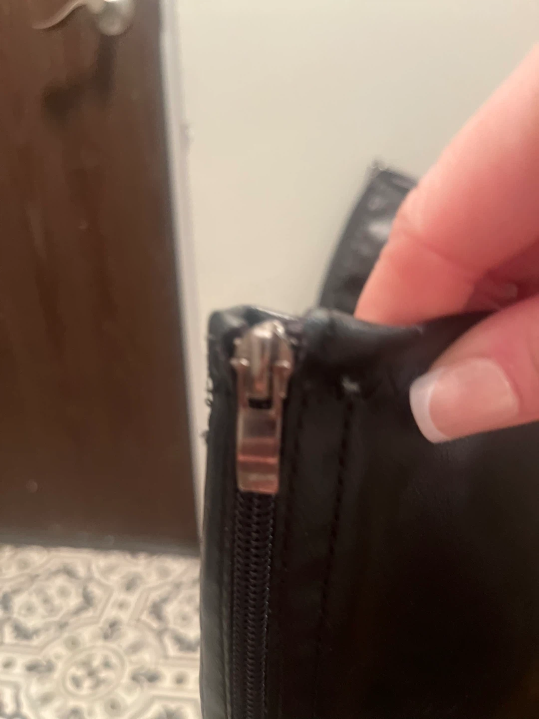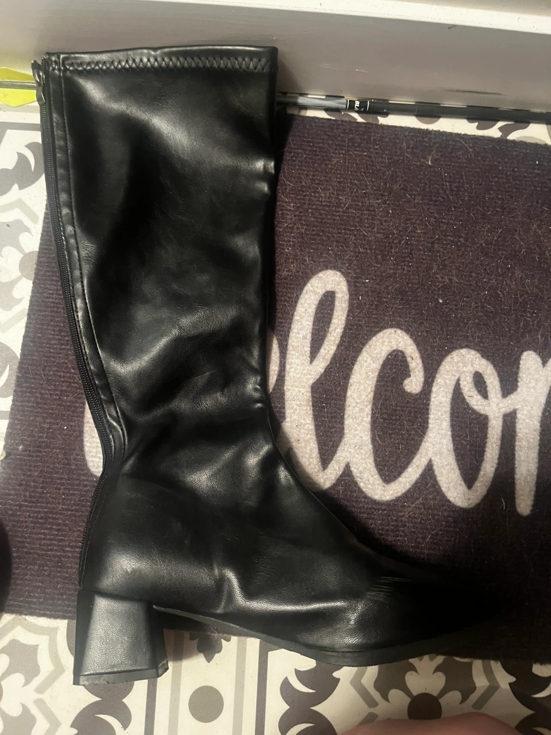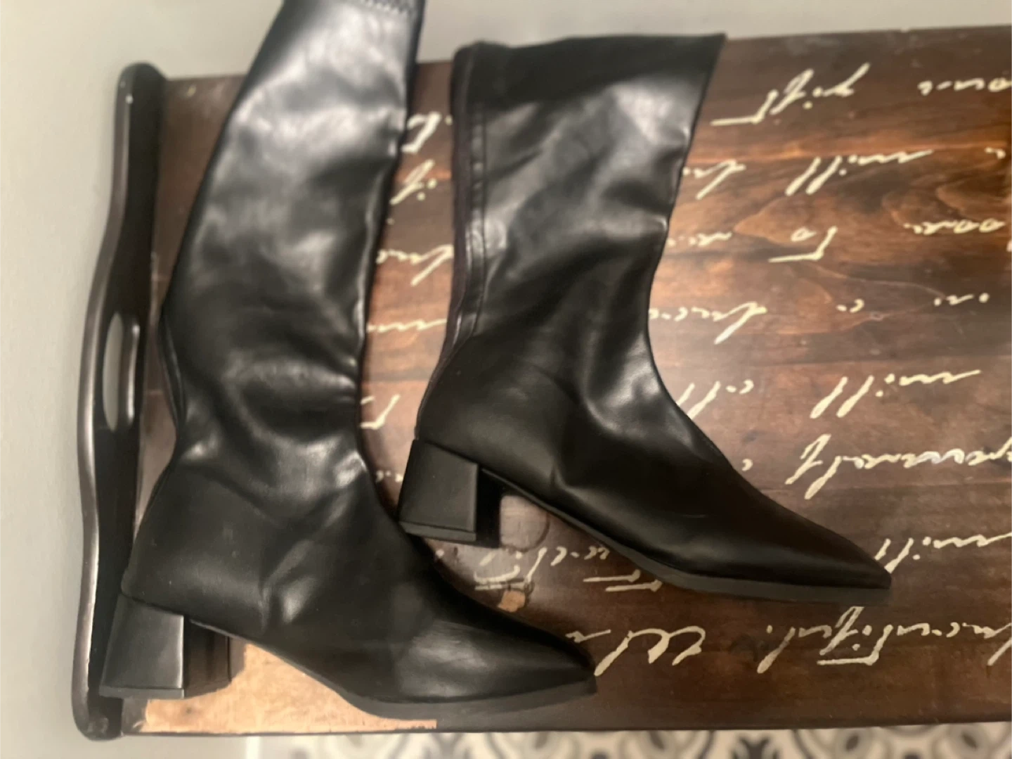 Selling a pair of black knee-high boots in. They feature a block heel and a zipper closure. Perfect for adding a stylish touch to any outfit! They fit size 9-10