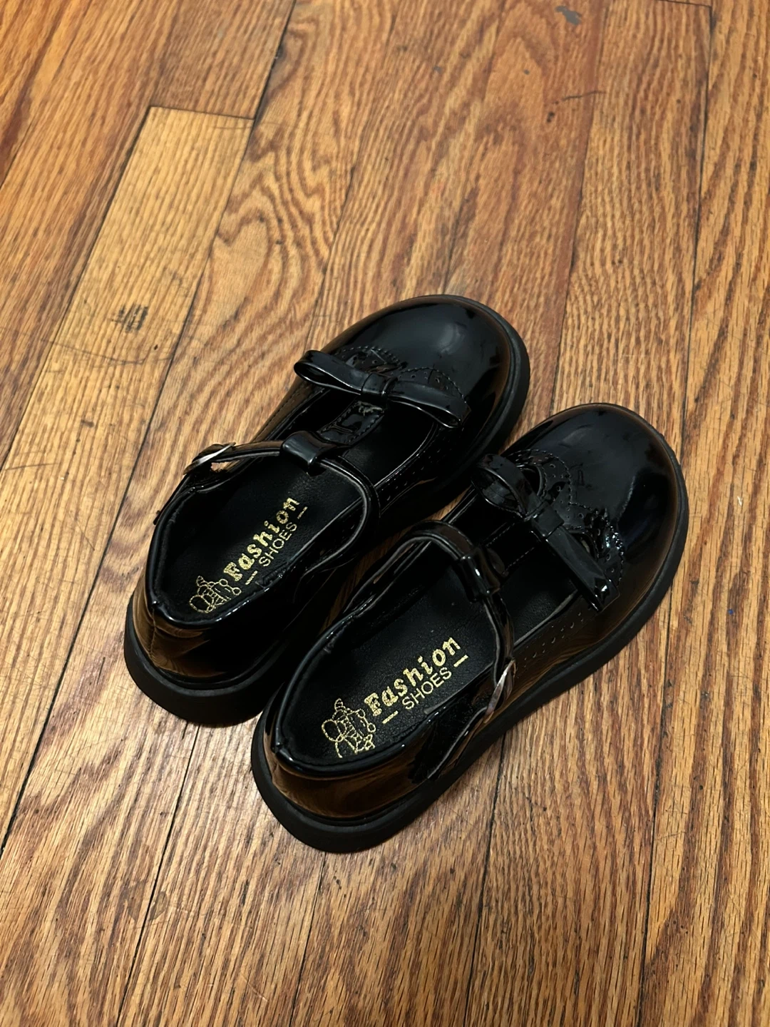 Classic black patent Mary Jane shoes for kids. Features a T-strap with a buckle closure and decorative bow. These fashion shoes are shiny and durable for young kids. The size is 13 in Kids