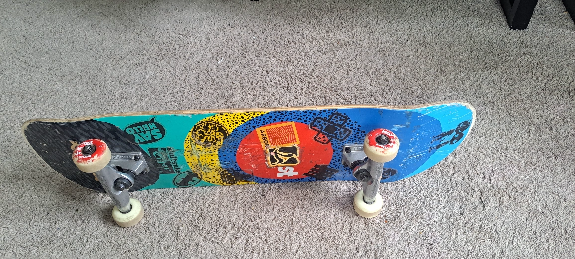 Selling a used Arbor skateboard with some wear and tear. It has a few stickers on it too! Great for someone looking to get into skateboarding or as a project board