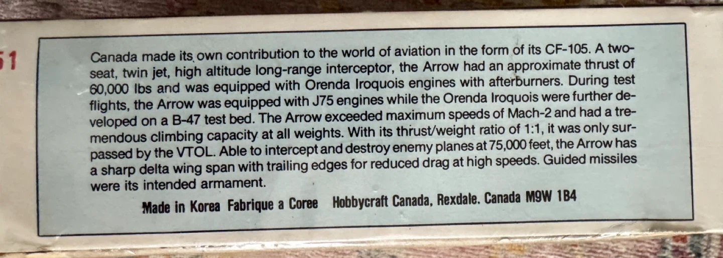 This is a 1/48 scale plastic model kit of the Avro Arrow CF-105 from the late 1980s. Made in Korea. Sealed in box however box does have some warping/damage.