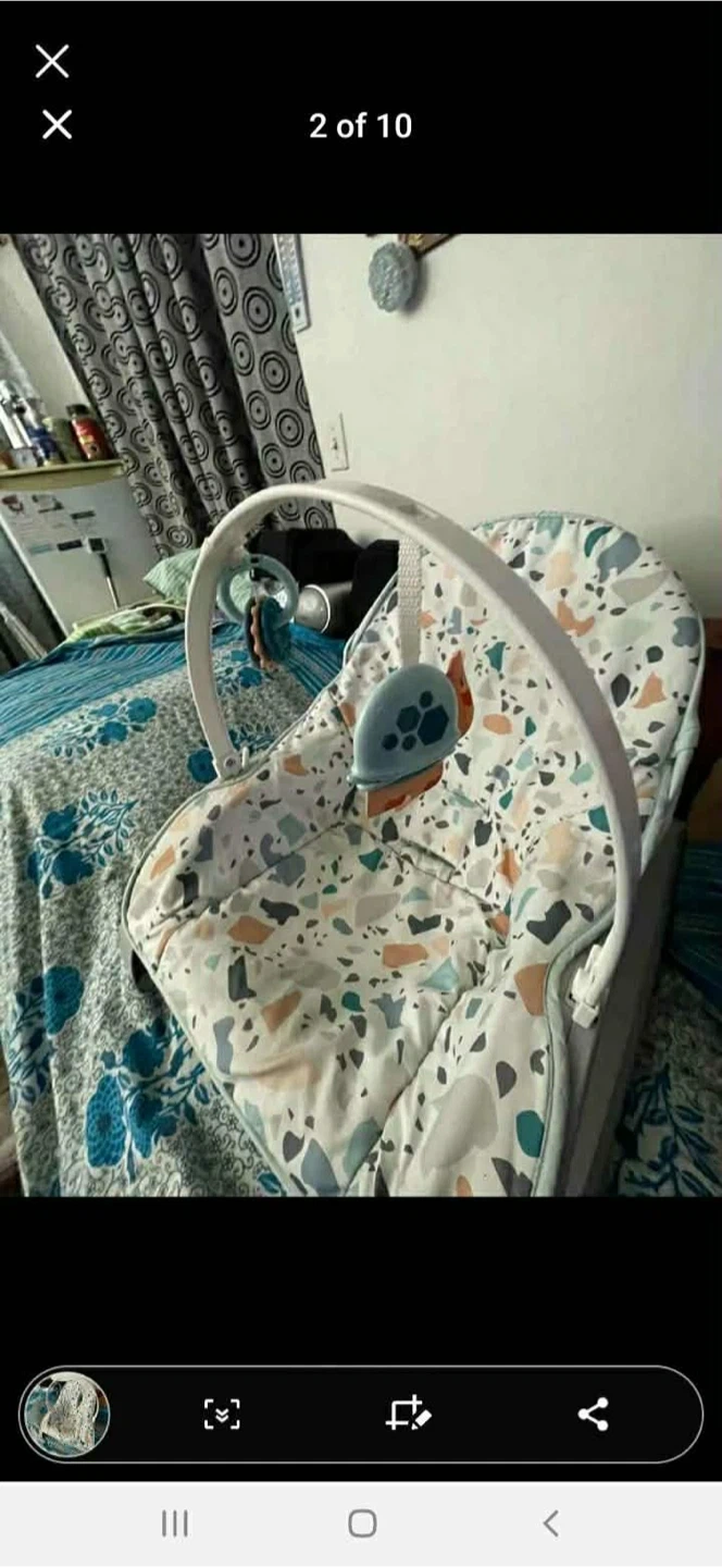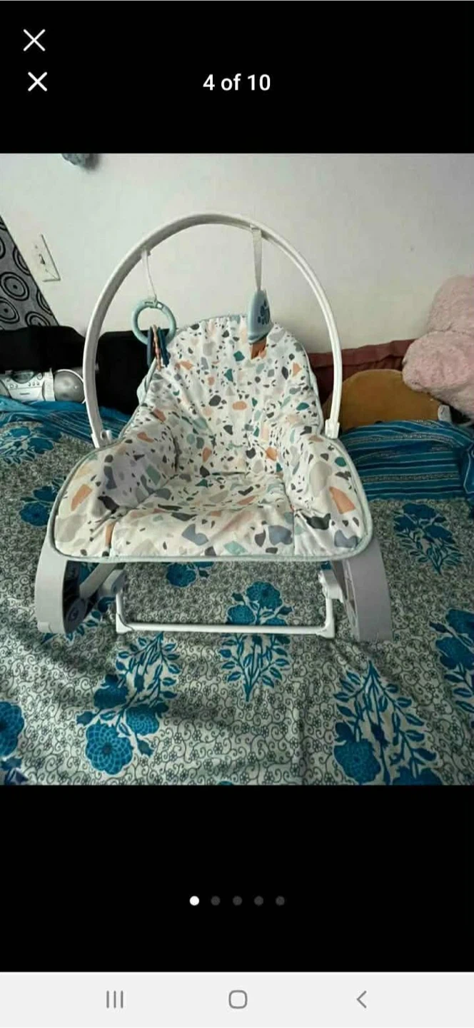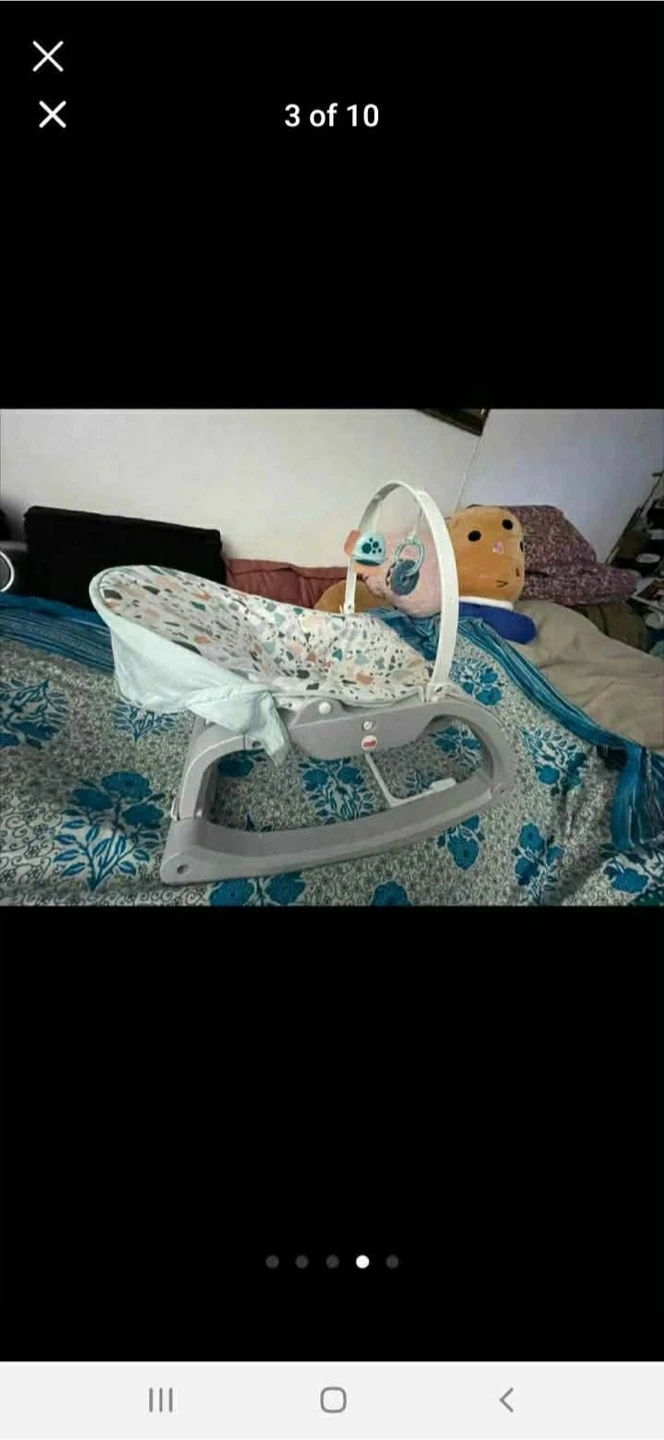 This Fisher-Price rocker bassinet offers a cozy spot for your little one. It features a gentle rocking motion and a removable toy bar with plush toys. The fabric is soft and patterned with a modern terrazzo design. It's perfect for newborns and infants.