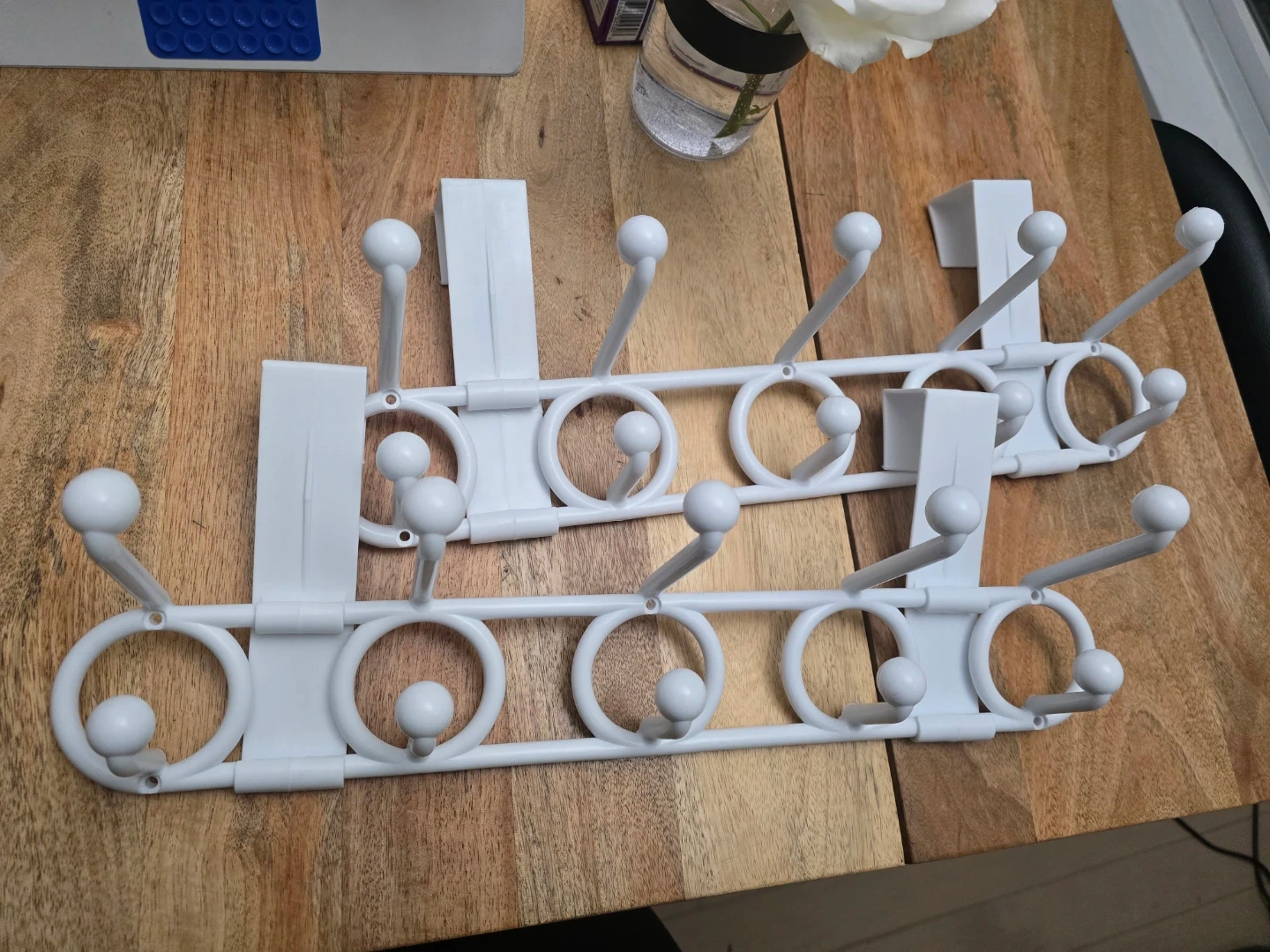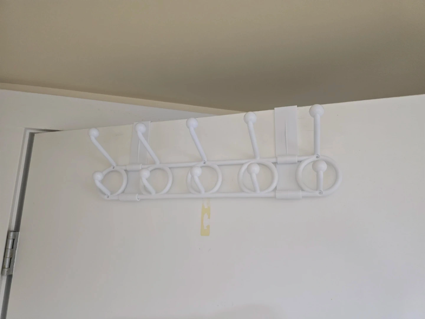 Two white over-the-door hook racks are available. Each rack has five hooks for hanging items. These are handy for organizing coats, bags, or towels in any room.