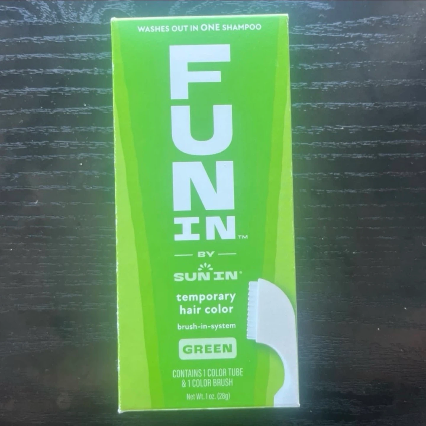 This is Sun In temporary hair color in green. It's a brush-in system that washes out in one shampoo. Contains 1 color tube and 1 color brush.