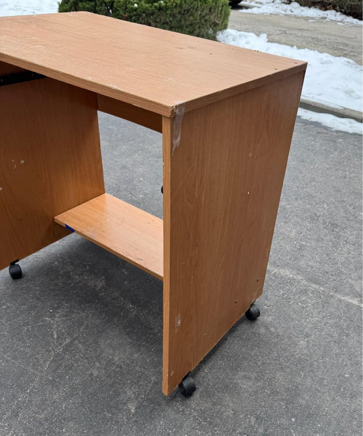 Selling a small wooden desk, perfect for a compact workspace! It is easy to move around with its wheels. It's in good condition and ready for a new home office setup