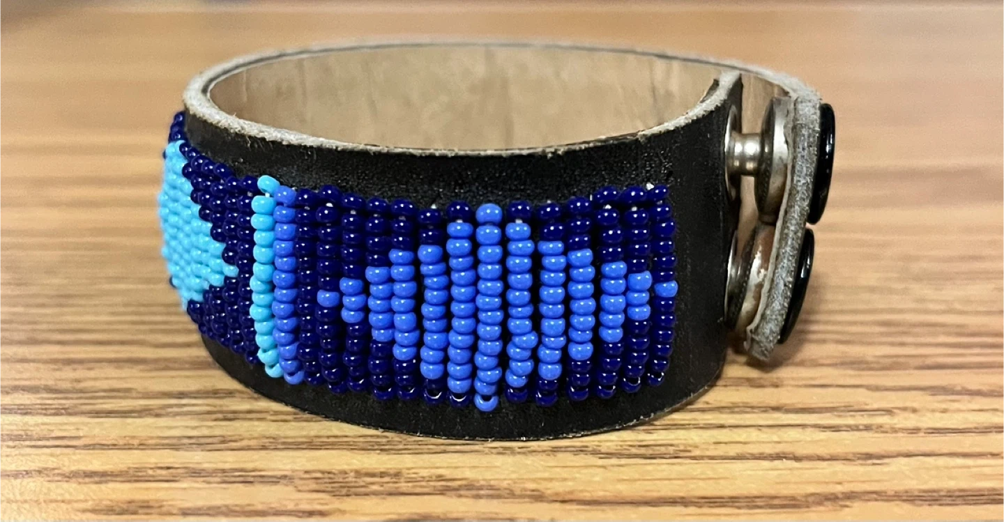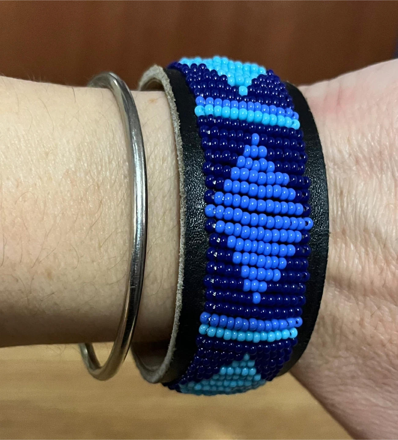 Add a pop of colour to your wrist with this eye-catching, used beaded bracelet, showcasing a unique blue geometric design. The bracelet is previously owned.