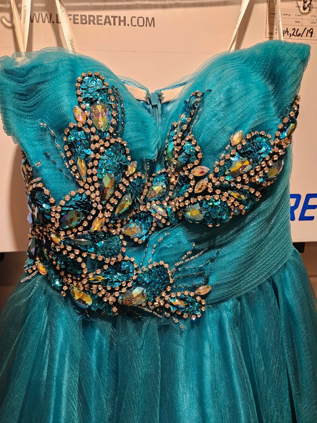 This Hannah S strapless dress is a vibrant teal colour. It features a sequined and beaded bodice. Tulle overlay skirt with a fun, flirty hem. Perfect for a special occasion or party!