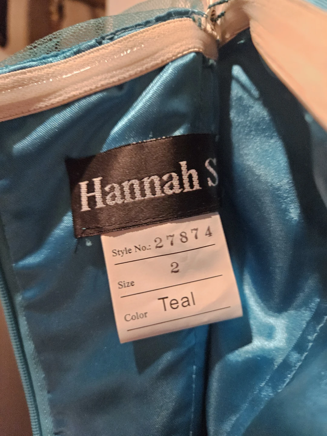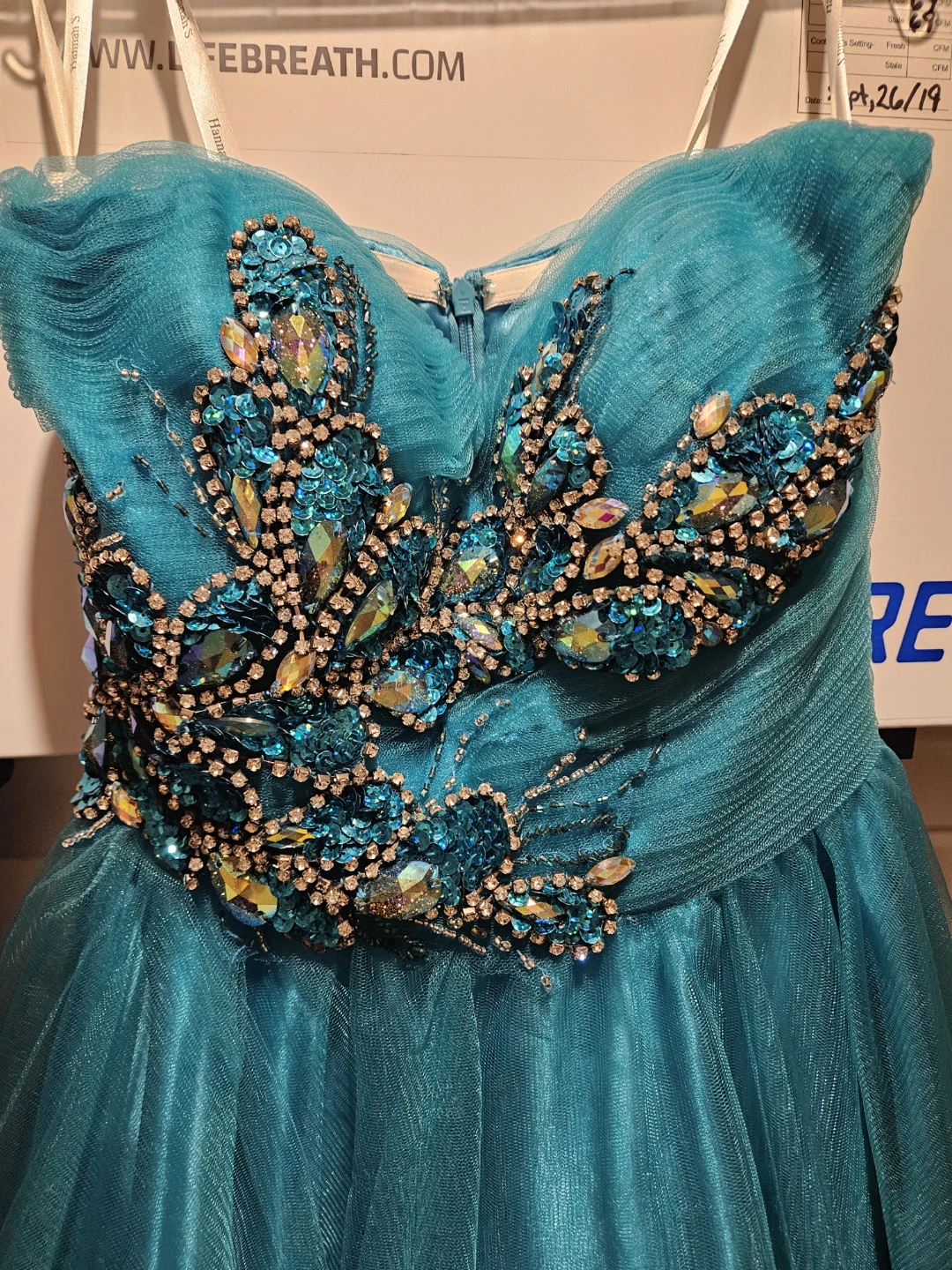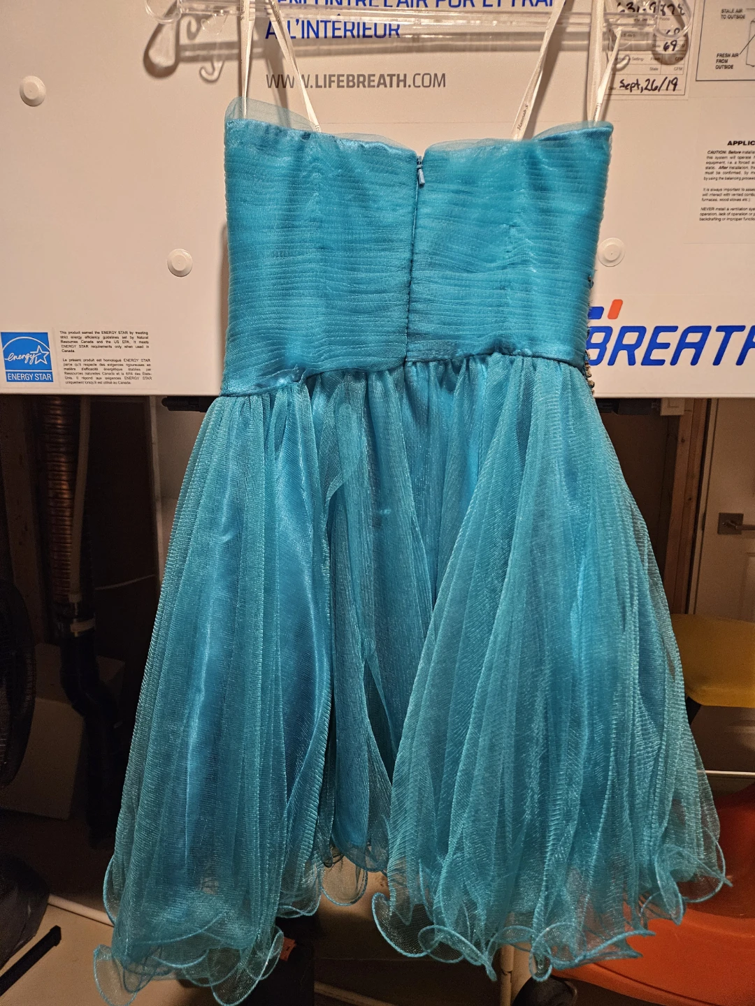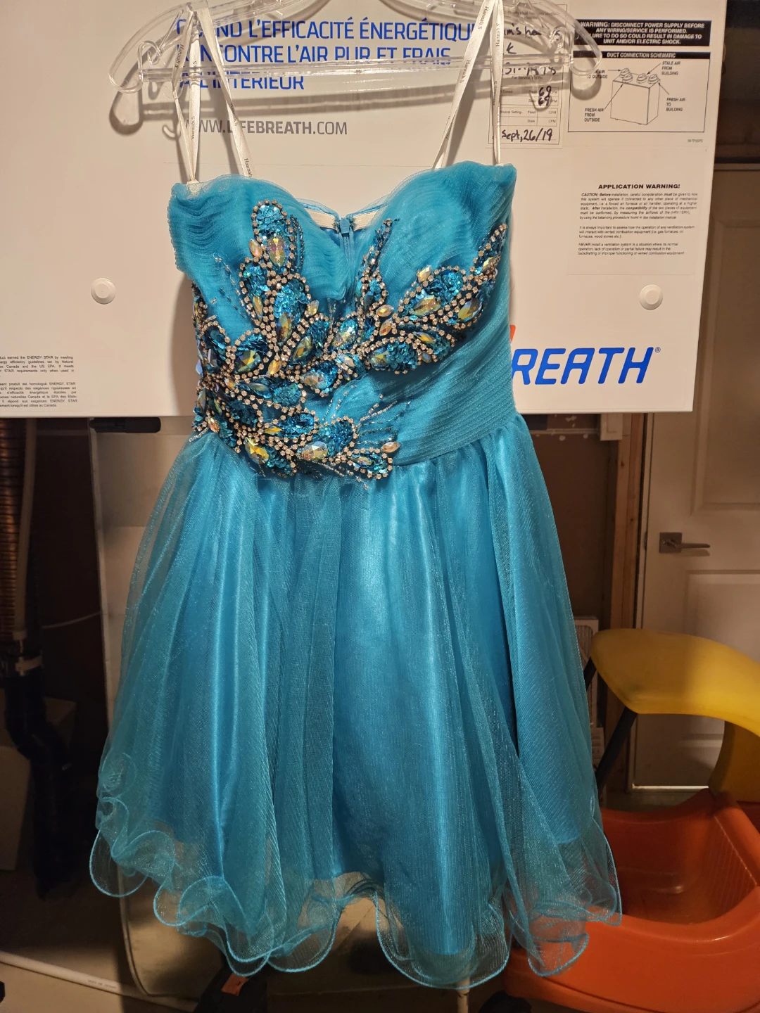 This Hannah S strapless dress is a vibrant teal colour. It features a sequined and beaded bodice. Tulle overlay skirt with a fun, flirty hem. Perfect for a special occasion or party!