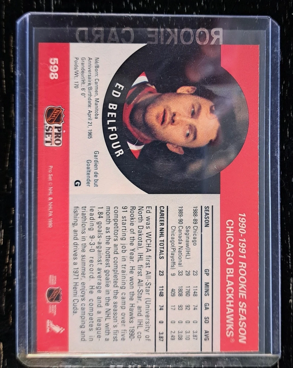 Original Upper Deck rookie cards for Jaromir Jagr (90-91), Pavel Bure (91-92), and Ed Belfour (90-91). All cards are standard size and in Near Mint or better condition. Card numbers are 54, 356, and 598. Features rookie cards from the 1990-91 and 1991-92 seasons. Players represented include Pavel Bure, Ed Belfour, and Jaromir Jagr. Teams include Pittsburgh Penguins, Vancouver Canucks, and Chicago Blackhawks.