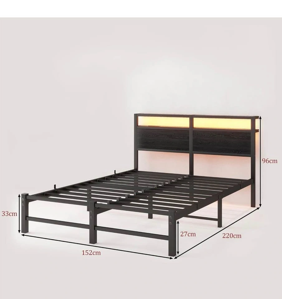 Modern queen bed frame with a black metal frame and a wooden headboard. The headboard has built-in LED lights with a remote control offering over 60,000 colors, adjustable brightness, dynamic modes, music sync, and mic mode. It also includes charging ports: 2 AC outlets and 2 USB ports. Plenty of under-bed storage space with 27cm clearance. Measures 152cm wide by 220cm long. Headboard is 96cm tall, frame is 33cm tall. Let me know if you're interested!