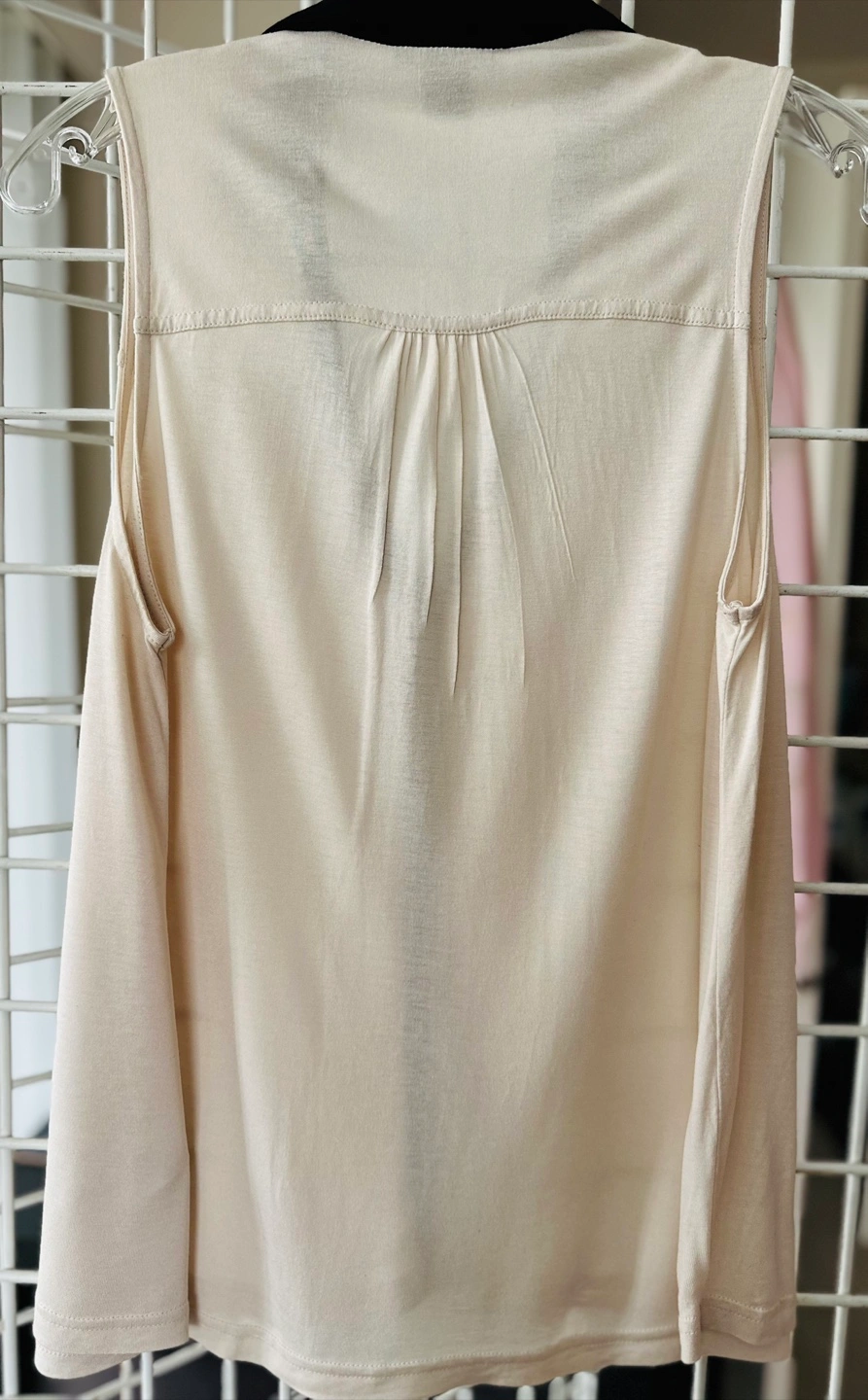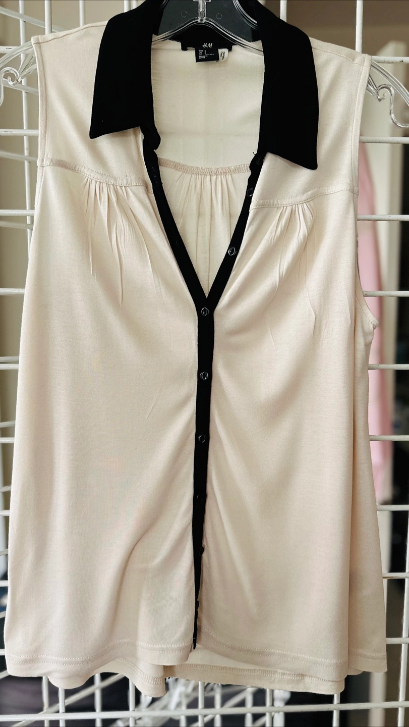 Cream-coloured sleeveless blouse. Features a black collar and button-down front. Size small. Made in China.