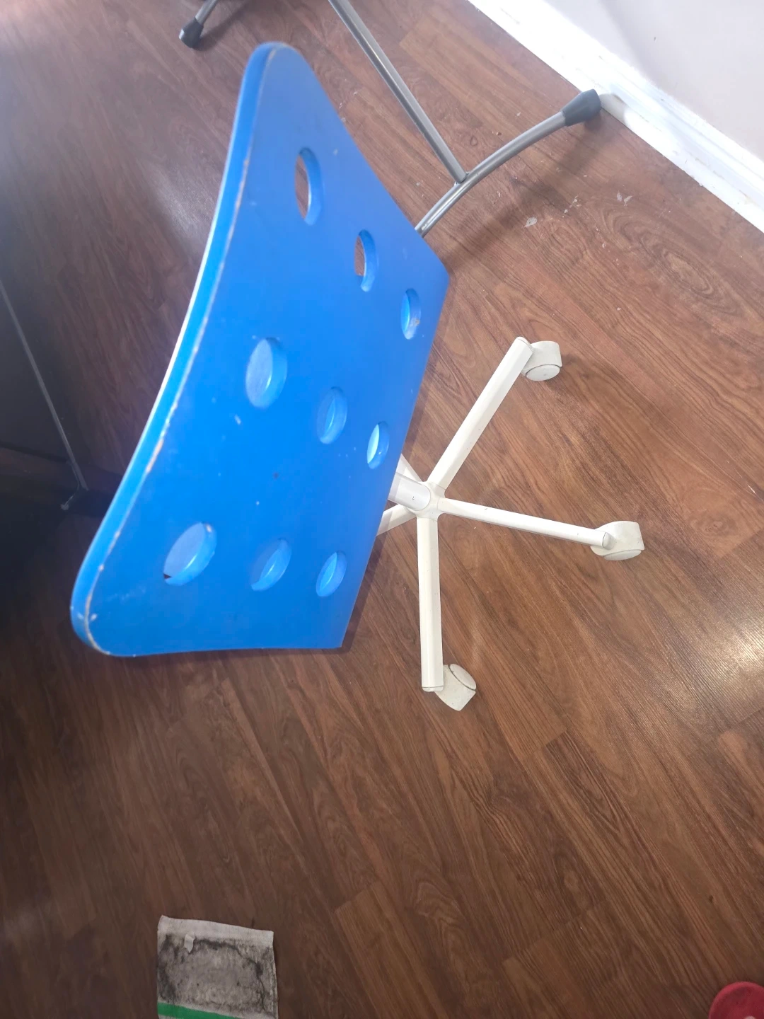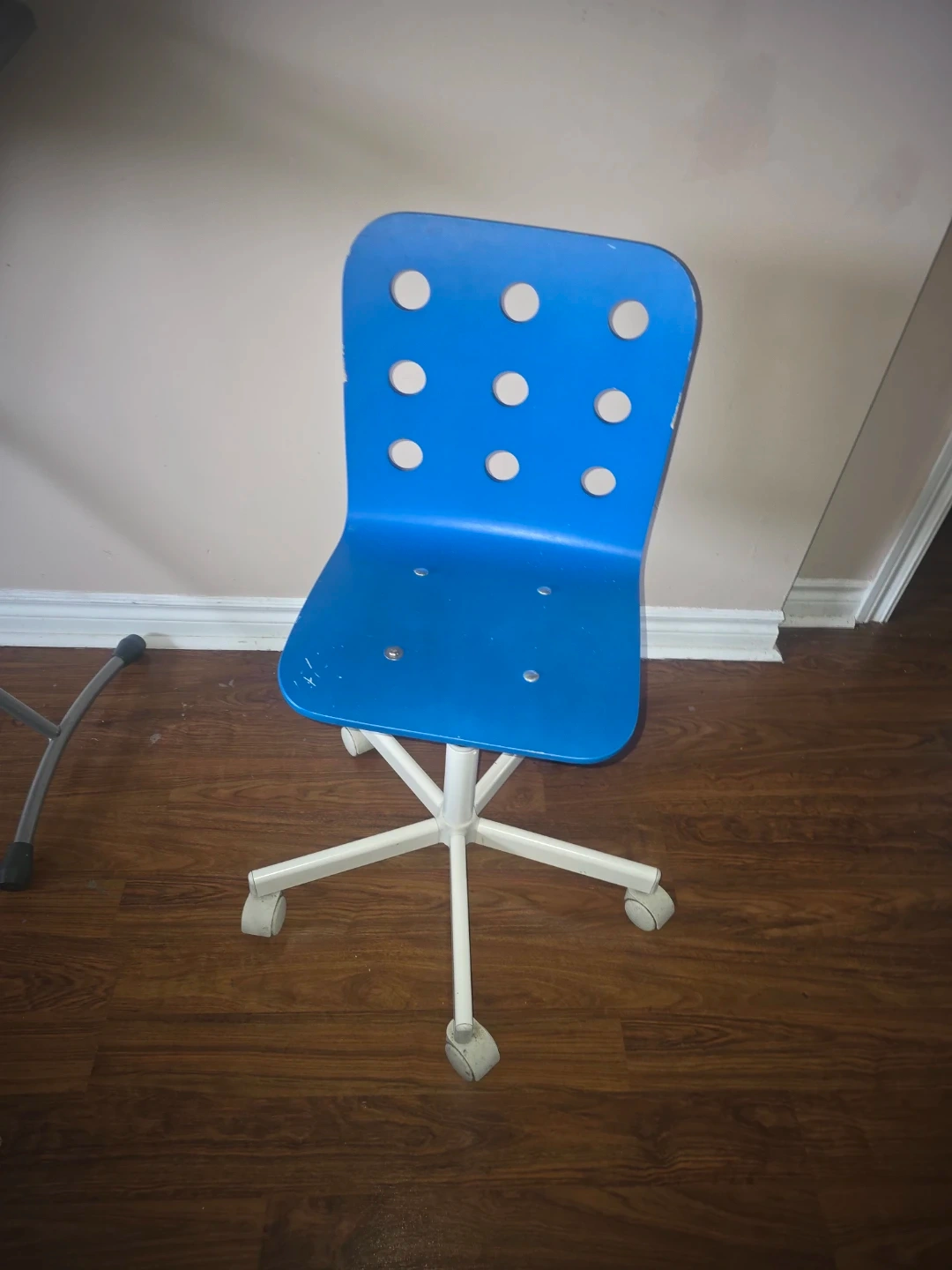 This blue office chair has a white base and wheels for easy movement. The seat and back are made of durable plastic. It's for kids