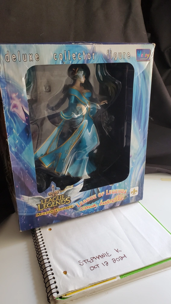 League of Legends Sona figure, in original packaging. Box is pretty beat up, the plastic window is falling off. sold as is.