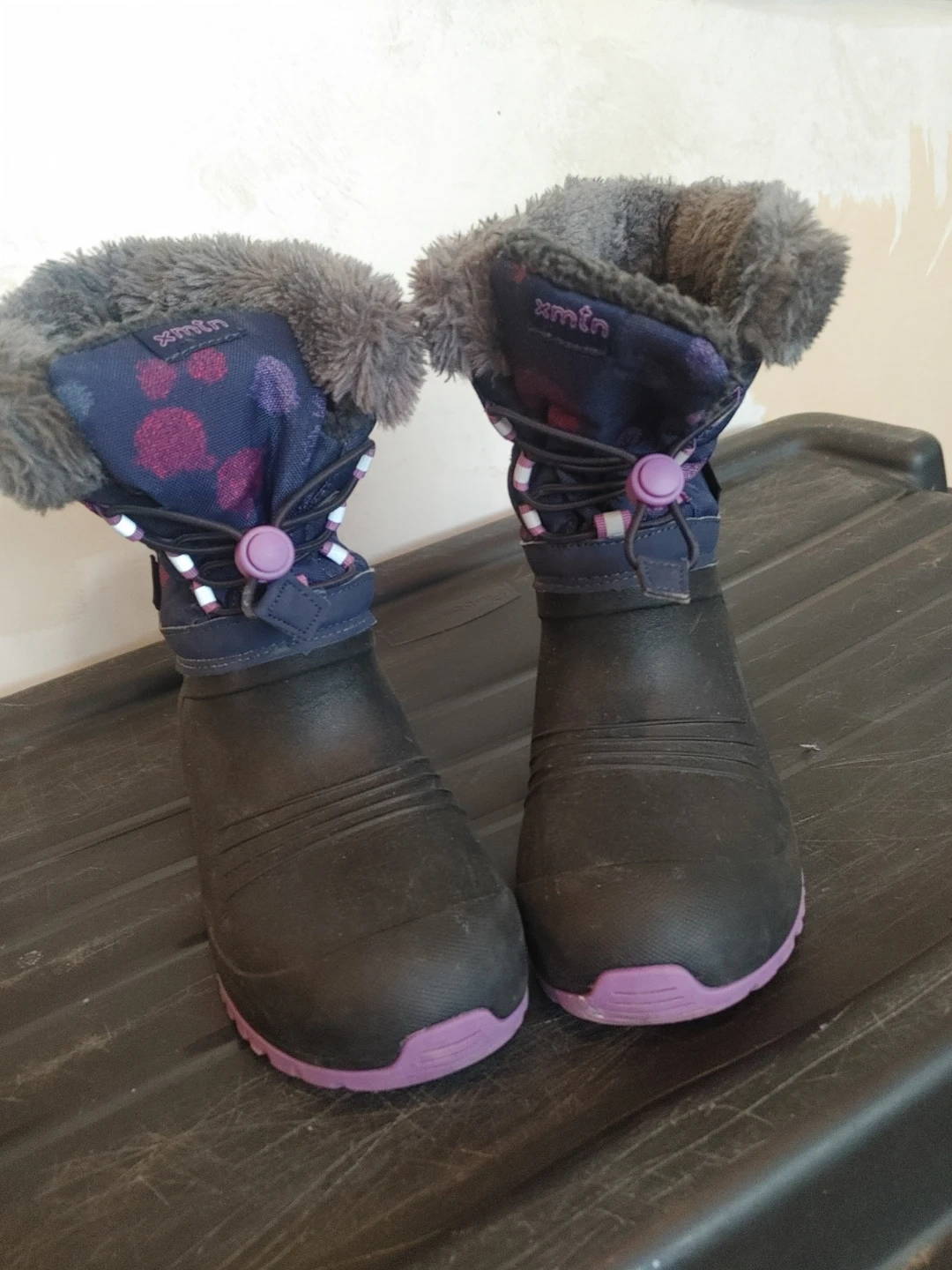 Kamik winter boots for girls in purple and black. These boots have a toggle closure system and fuzzy trim. They're designed for cold weather. Perfect for keeping little feet warm and dry on snowy days! Only worn twice! Size 2