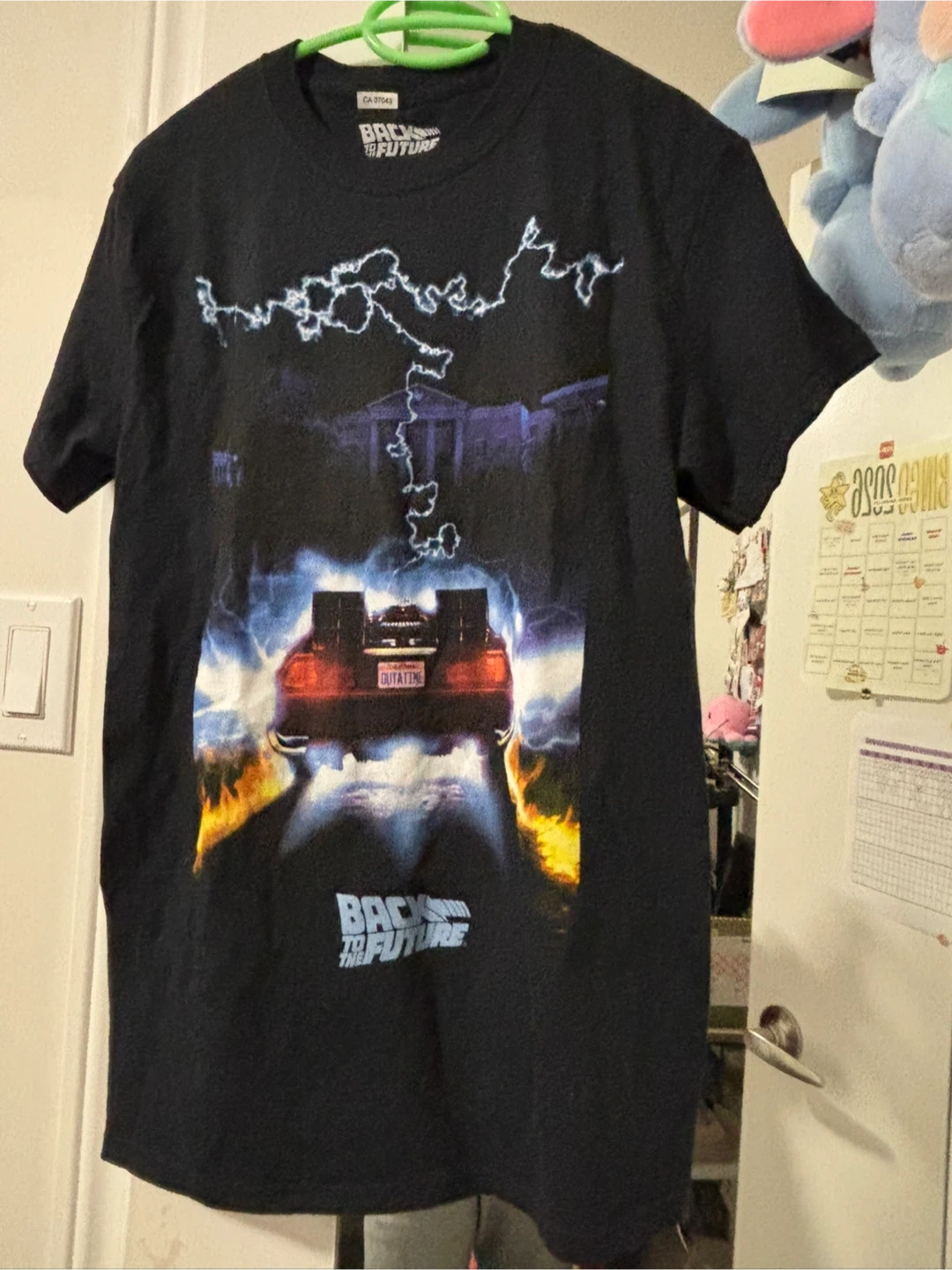 This black t-shirt features the iconic DeLorean time machine from Back to the Future. It's made from 100% cotton. This shirt is a size small.